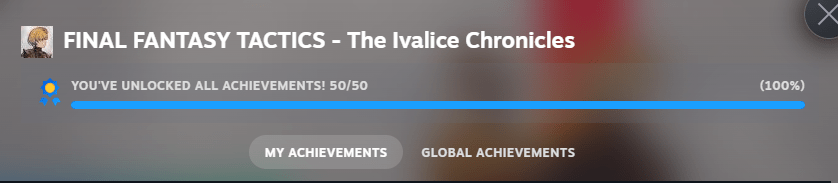 Upon completion, I finished every Steam achievement in the game, joining 2.1% of other FFT fanatics: