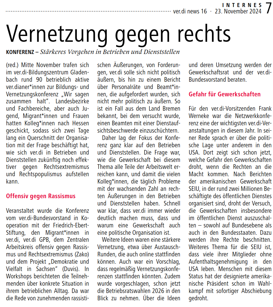 Veranstaltet wurde die Konferenz vom ver.di-Bundesvorstand in Kooperation mit der Friedrich-Ebert-Stiftung, den Migrant*innen in ver.di, ver.di GPB, dem Zentralen Arbeitskreis offensiv gegen #Rassismus und #Rechtsextremismus (Zako) und dem Projekt „Demokratie und Vielfalt in Sachsen“ (#Duvis). In Workshops berichteten die Teilnehmenden über konkrete Situation in ihrem betrieblichen Alltag. Da war die Rede von zunehmenden rassistischen Äußerungen, von Forderungen, ver.di solle sich nicht politisch äußern, bis hin zu einem Bericht über #Personalräte und Beamt*innen, die aufgefordert wurden, sich nicht mehr politisch zu äußern. So ist ein Fall aus dem Land #Bremen bekannt, bei dem versucht wurde, einen Beamten mit einer #Dienstaufsichtsbeschwerde einzuschüchtern.
