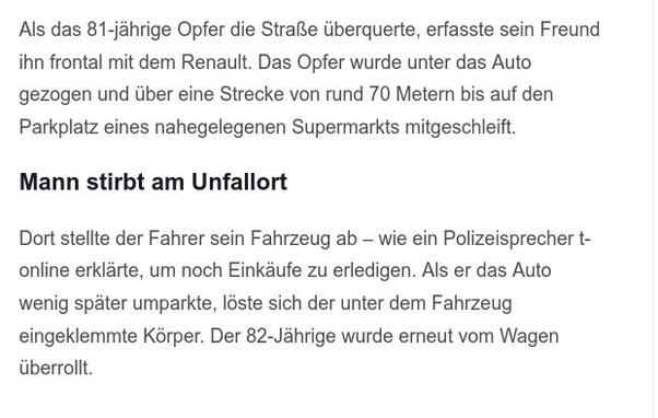 In Rechberghausen (Baden-Württemberg) ist ein 82 Jahre alter Mann am Montag gegen 19.20 Uhr von einem Auto erfasst, mitgeschleift und überrollt worden. Am Steuer saß ein 81-jähriger Bekannter des Opfers. www.t-online.de/nachrichten/... #Fahrtauglichkeit