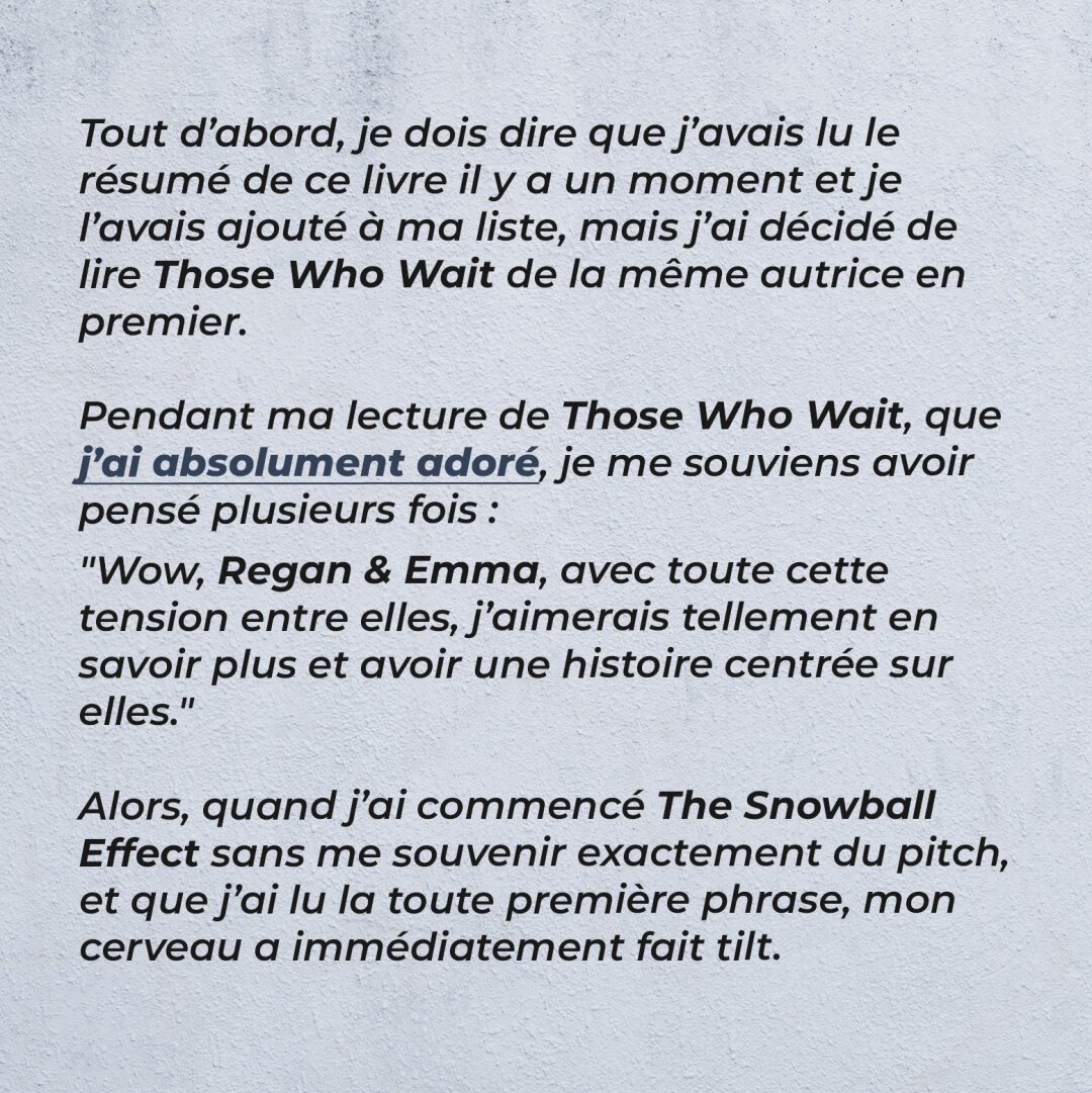 So, when I started The Snowball Effect without fully remembering the premise, and I read the very first sentence… My brain just clicked.