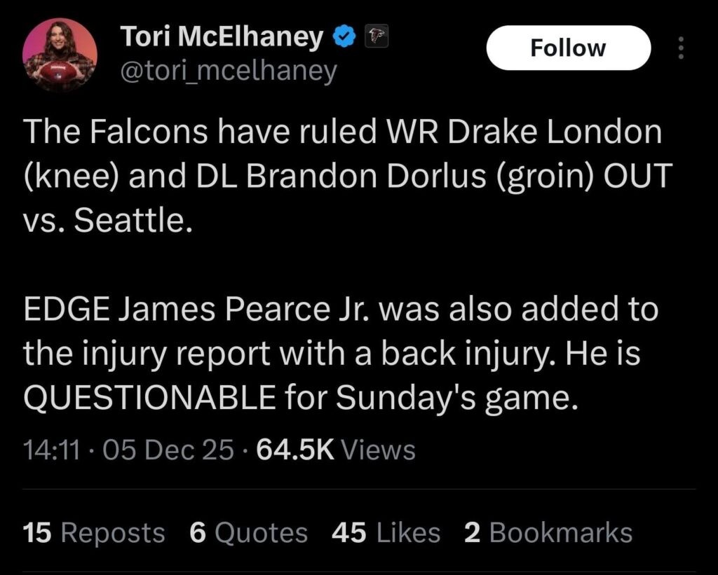 #Falcons will be without two key starters for Sunday’s matchup vs. #Seahawks —Drake London and Brandon Dorlus are OUT! https://www.ajc.com/sports/2025/12/falcons-will-be-without-two-key-starters-for-sundays-matchup-vs-seahawks/