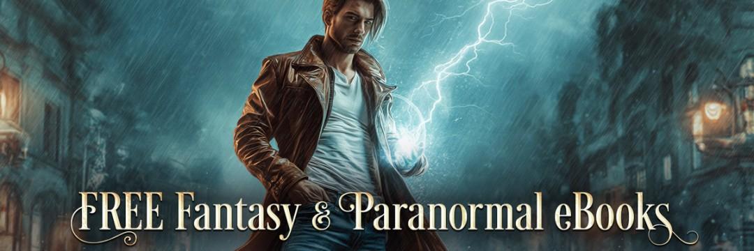 A photo of a man wielding lightning beneath a storm-lit sky. The words FREE FANTASY & PARANORMAL eBOOKS are below.