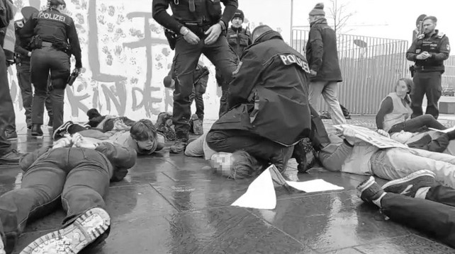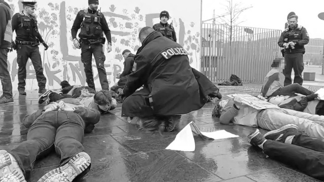 Auf einem Video, das die Protest-Aktion der #LetztenGeneration am Samstagvormittag zeigt, hockt ein Bundespolizist über einem bereits am Boden liegenden Mädchen. Sie liegt auf dem Bauch. In dem Video, das gut 90 Sekunden dauert, hockt der Beamte fast 60 Sekunden mit dem Knie auf Kopf, Nacken und Gesicht der U-16-Jährigen.
