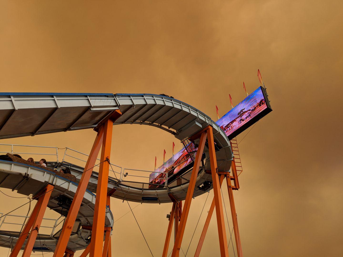 Orange County Fair carnival rides below a backdrop of wildfire smoke. Sunlight was dim and yellow, the sun was blood red, and in the evening an orange glow silhouetted the mountains in the distance.