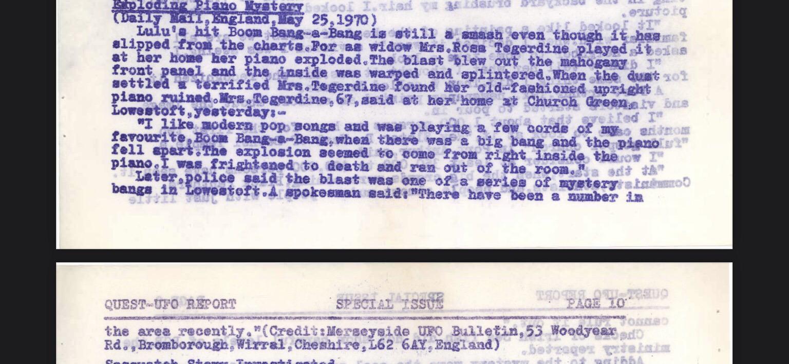 Uncertain if the publication in two UFO newsletters is meant to imply an extraterrestrial angle to the Exploding Piano Mystery, or if both of those periodicals had broader, more Fortean, themes.