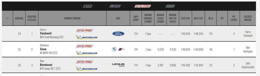 Nos #GTDPro, #Hawksworth ao volante do #Lexus 14 consegue ir segurando os ataques de #MaroEngel e seu #Mercedes 79, com #Garcia, um habituee das #LeMans24 em terceiro na categoria, como de costume ao volante de um #Corvette (número 3).