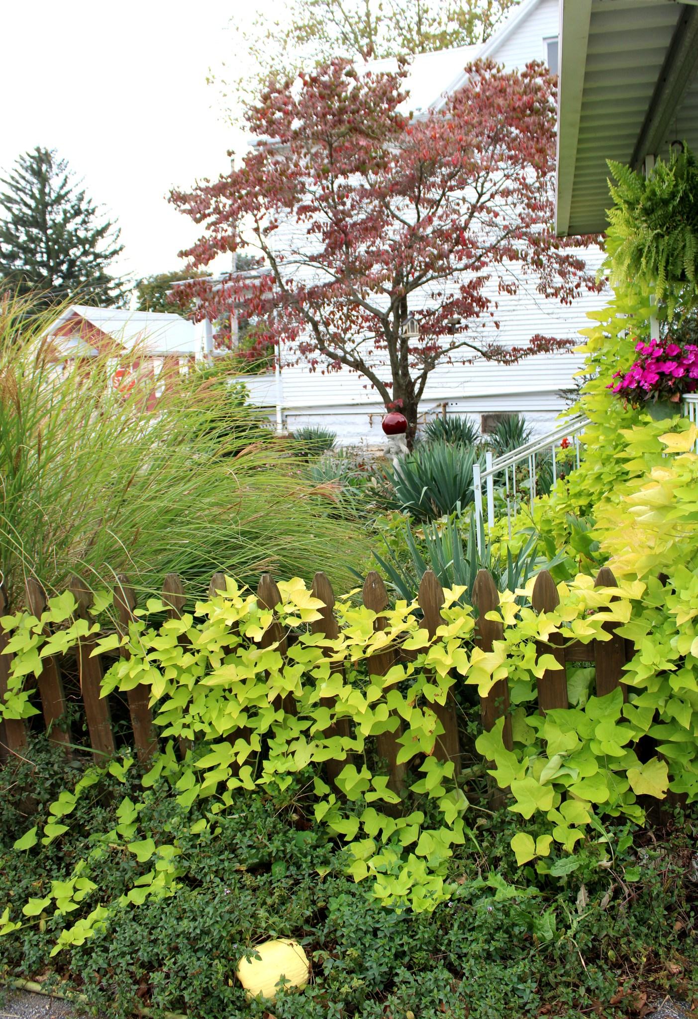 Old Fart's Fecund Fall Garden. #garden #gardener #gardening #pennsylvaniagarden #pennsylvaniagardens #eastcoast #pennsylvania #dogwoodtree #dogwood #bostonfern #bostonferns #sweetpotatovine #yucca #yucca #grass #grasses
