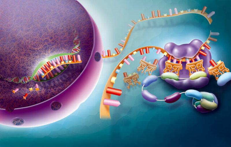 A cartoon diagram of gene activity, with a purple cell nucleus in the upper left, and a strand of RNA extending out into a bluish cytoplasm.