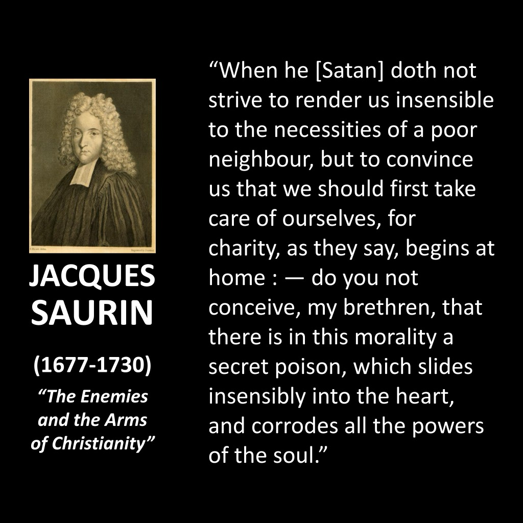 Jacques Saurin was a French Reformed pastor. He says Satan is an enemy of the church, out to make us insensible to the needs of poor neighbors. The devil is behind this idea of “charity begins at home.” Saurin warns his brethren that this moral vision is a secret poison that corrodes all the powers of the soul.