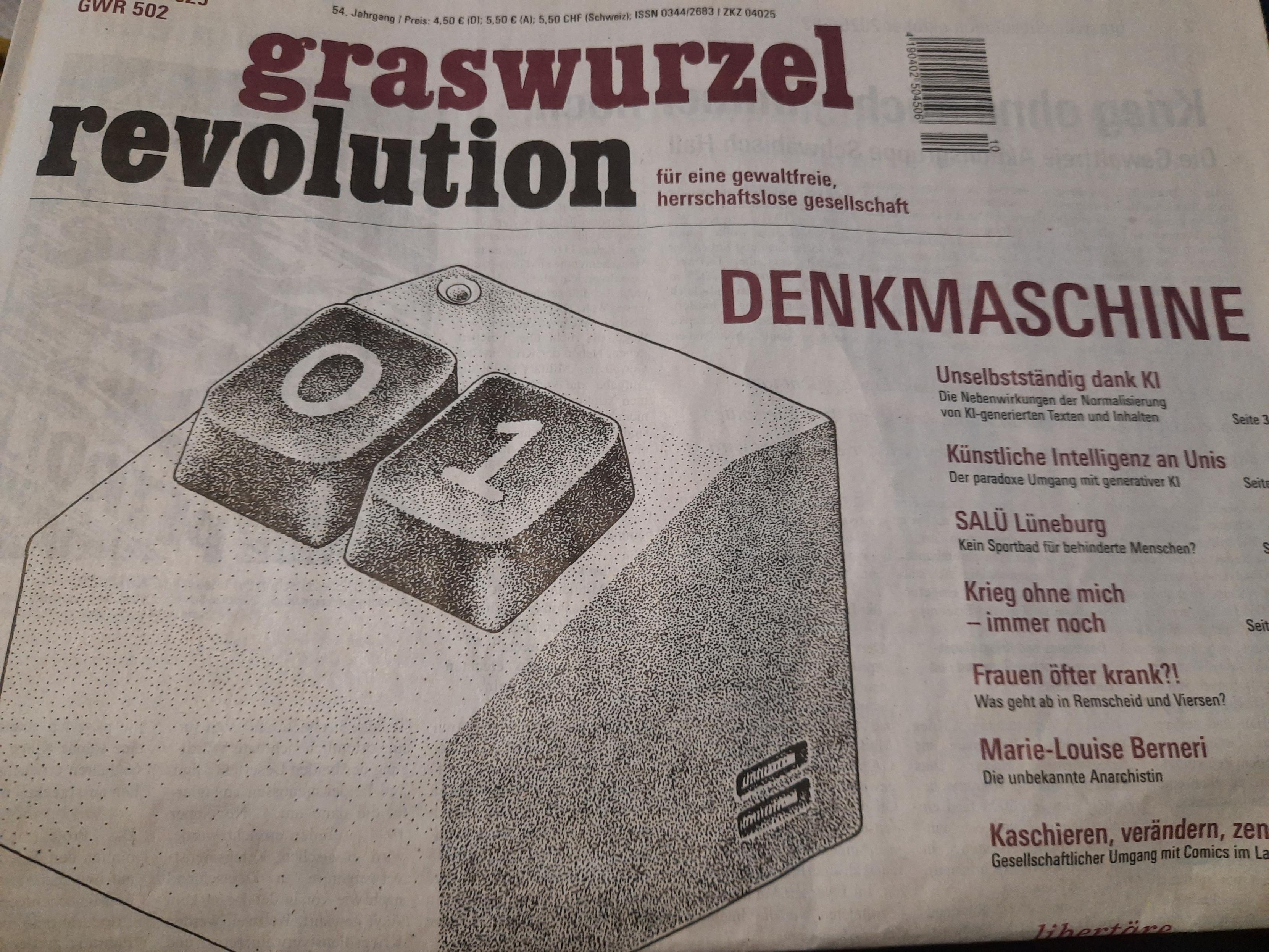 Die #Abendlektüre: Die aktuelle #Graswurzelrevolution #gwr502 zum Thema #KI und KI an der #hochschule - und weiteren wertvollen Artikeln, etwa einem Portrait von Marie-Luise Berneri. #artificialintelligence and #anarchism @Graswurzelrevolution