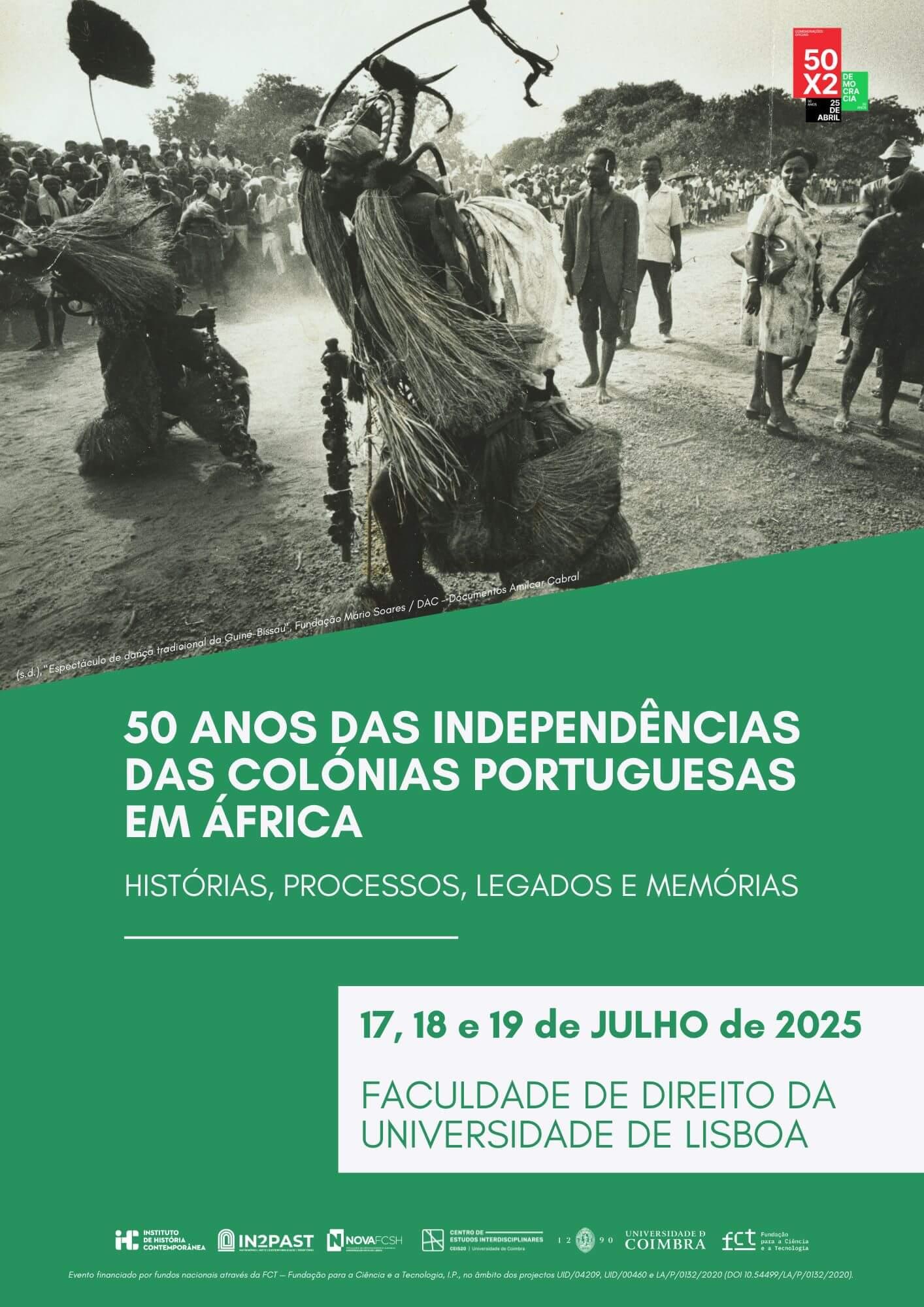 ![Poster for the international conference ‘50 Years of Independence of the Portuguese Colonies in Africa: Histories, Processes, Legacies and Memories’ [In Portuguese: 50 Anos das Independências das Colónias Portuguesas em África: Histórias, Processos, Legados e Memórias]. 17, 18 and 19 July 2025, at University of Lisbon Law School. The poster includes a photograph taken in Guinea Bissau during a traditional dance show, where two men disguised with straw and wooden props (among other materials) are dancing in a yard while being watched by a small crowd.](https://files.mastodon.social/cache/media_attachments/files/114/858/214/287/787/560/small/484b04ed4045bd80.jpg)