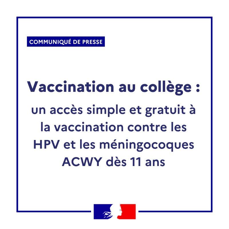 #Communiqué 🗞️ | #Vaccination au collège : un accès simple et gratuit à la vaccination contre les #HPV et les #méningocoques ACWY dès 11 ans