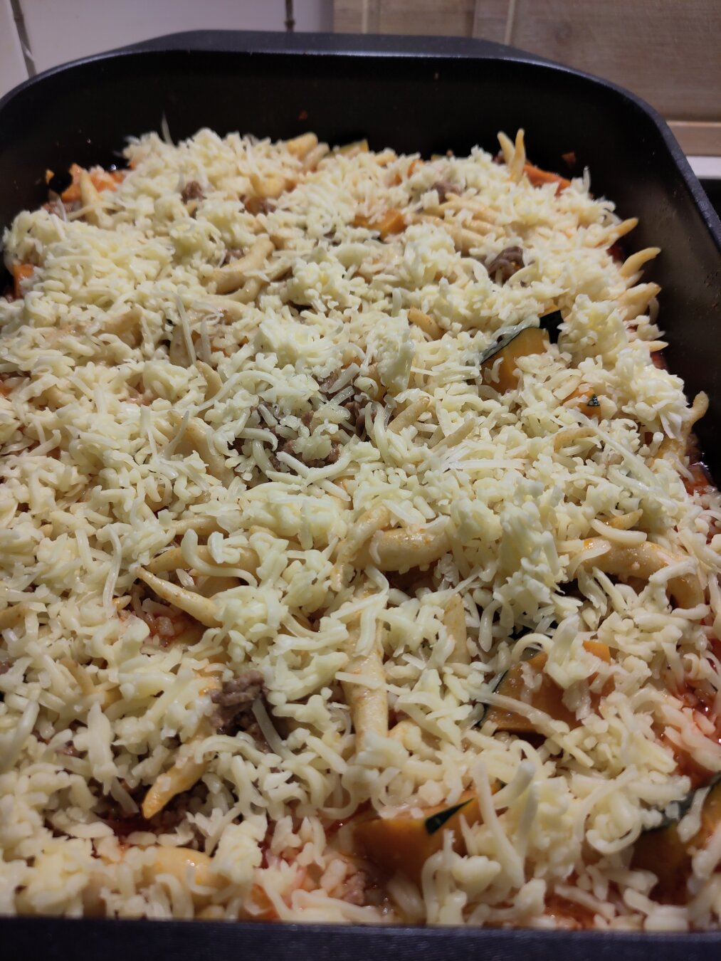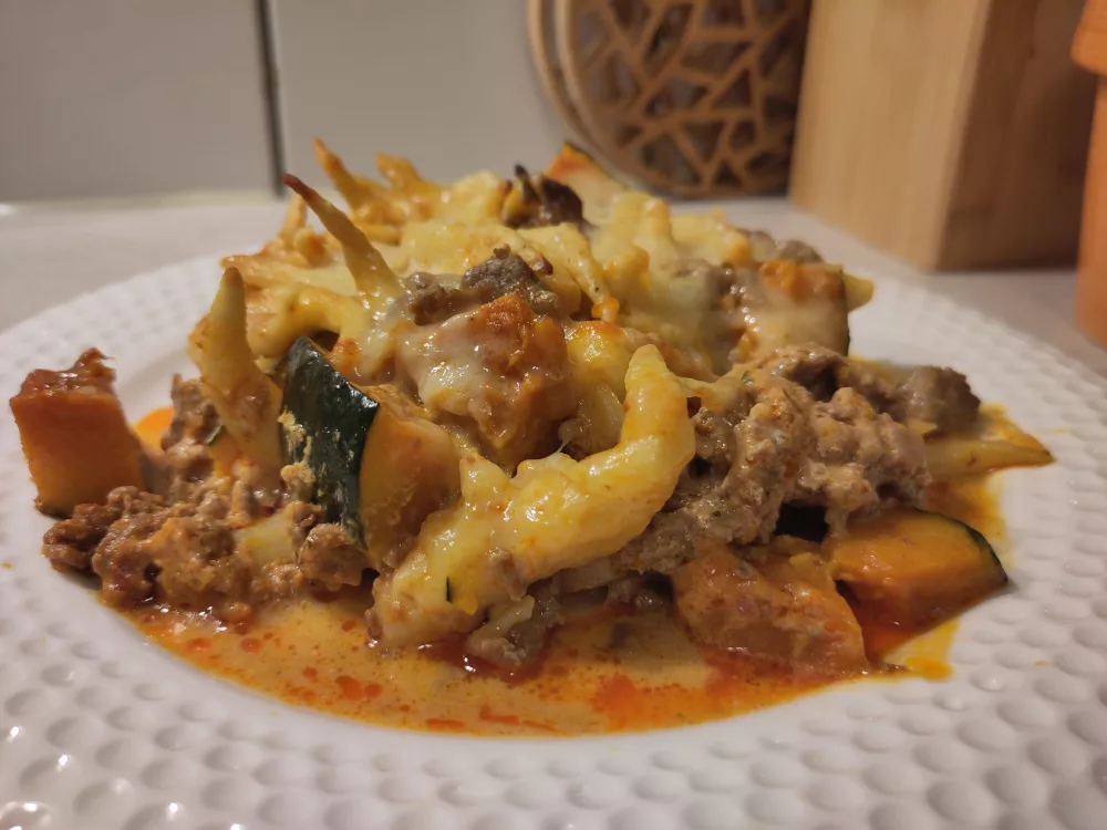 Hackfleisch-Kürbis Auflauf mit Schupfnudeln (6 Portionen)