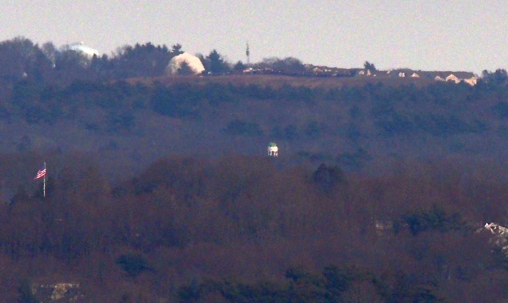 The dome of Hingham Town Hall, 210 Central St, Hingham MA photographed from Buck Hill. Behind the town hall are a water tower, a building from the MassDOT maintenance facility, and The Preserve at Cohasset apartment complex, all in Cohasset MA. The flag and flagpole are at King Oak Hill Park in Weymouth MA.