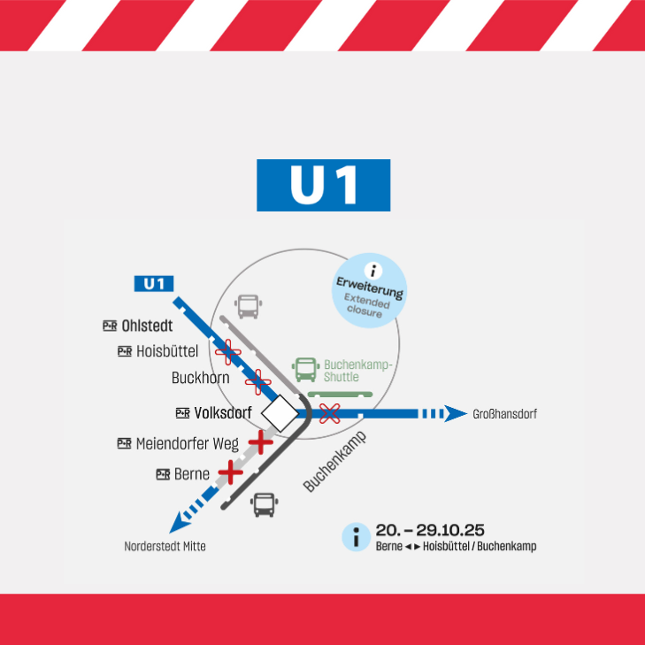 Die guten News vorweg: Es sieht gut aus, dass die #U1Hamburg-Züge ab 1.12. wieder wie gewohnt für euch rollen! Nur die denkmalgerechte Sanierung der U Volksdorf ist etwas komplizierter als gedacht. Vom 20.-29.10. erweitern wir die Sperrung daher einmal auf Berne - Hoisbüttel/Buchenkamp.