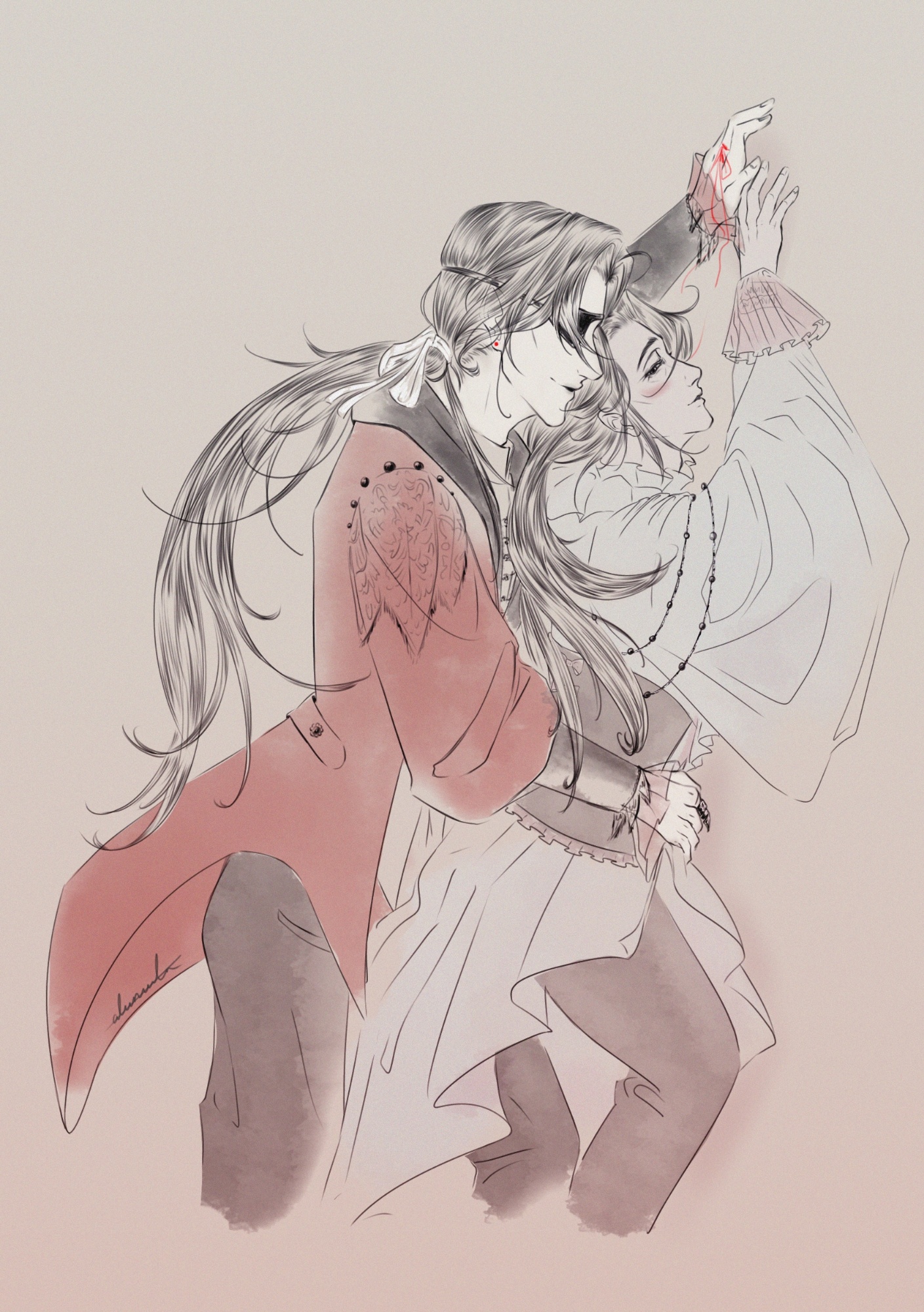 With regret, Hua Cheng pulls back. "Let me dress you," he requests. It's taken some time to reach this point, but Xie Lian will occasionally accept clothes that suit him.