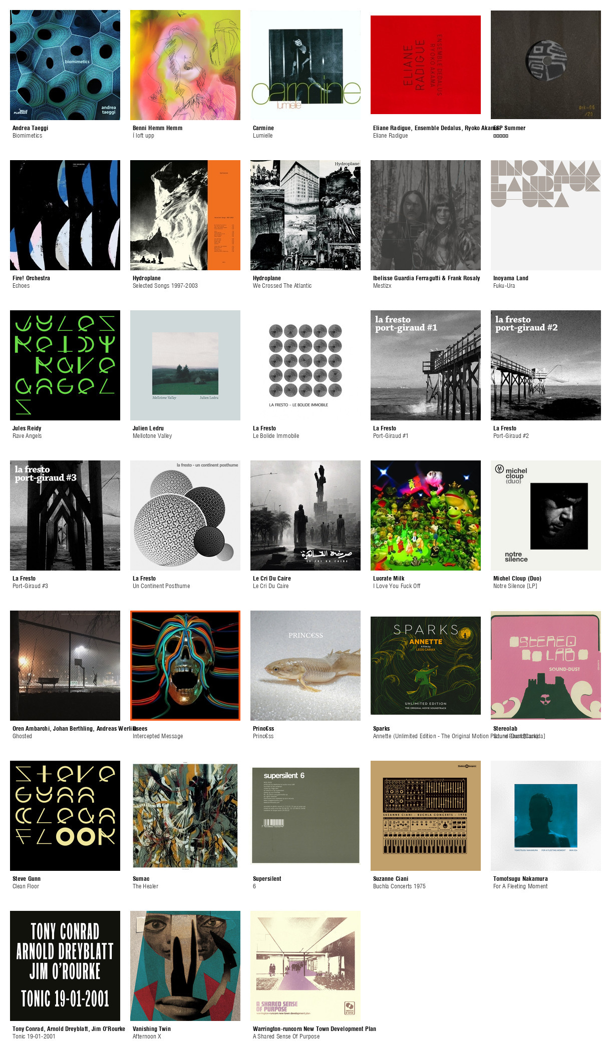 ![Collage des pochettes des albums de Andrea Taeggi (Biomimetics), Benni Hemm Hemm (Í loft upp), Carmine (Lumielle), Eliane Radigue, Ensemble Dedalus, Ryoko Akama (Eliane Radigue), ESP Summer (天国の王国), Fire! Orchestra (Echoes), Hydroplane (Selected Songs 1997-2003), Hydroplane (We Crossed The Atlantic), Ibelisse Guardia Ferragutti & Frank Rosaly (Mestizx), Inoyama Land (Fuku-Ura), Jules Reidy (Rave Angels), Julien Ledru (Mellotone Valley), La Fresto (Le Bolide Immobile), La Fresto (Port-Giraud #1), La Fresto (Port-Giraud #2), La Fresto (Port-Giraud #3), La Fresto (Un Continent Posthume), Le Cri Du Caire (Le Cri Du Caire), Lucrate Milk (I Love You Fuck Off), Michel Cloup (Duo) (Notre Silence [LP]), Oren Ambarchi, Johan Berthling, Andreas Werliin (Ghosted), Osees (Intercepted Message), Princ€ss (Princ€ss), Sparks (Annette (Unlimited Edition - The Original Motion Picture Soundtrack)), Stereolab (Sound-Dust [Canada]), Steve Gunn (Clean Floor), Sumac (The Healer), Supersilent (6), Suzanne Ciani (Buchla Concerts 1975), Tomotsugu Nakamura (For A Fleeting Moment), Tony Conrad, Arnold Dreyblatt, Jim O'Rourke (Tonic 19-01-2001), Vanishing Twin (Afternoon X), Warrington-runcorn New Town Development Plan (A Shared Sense Of Purpose)](https://files.mastodon.social/cache/media_attachments/files/112/986/955/570/783/321/small/b4a60340cc4c7be7.jpg)