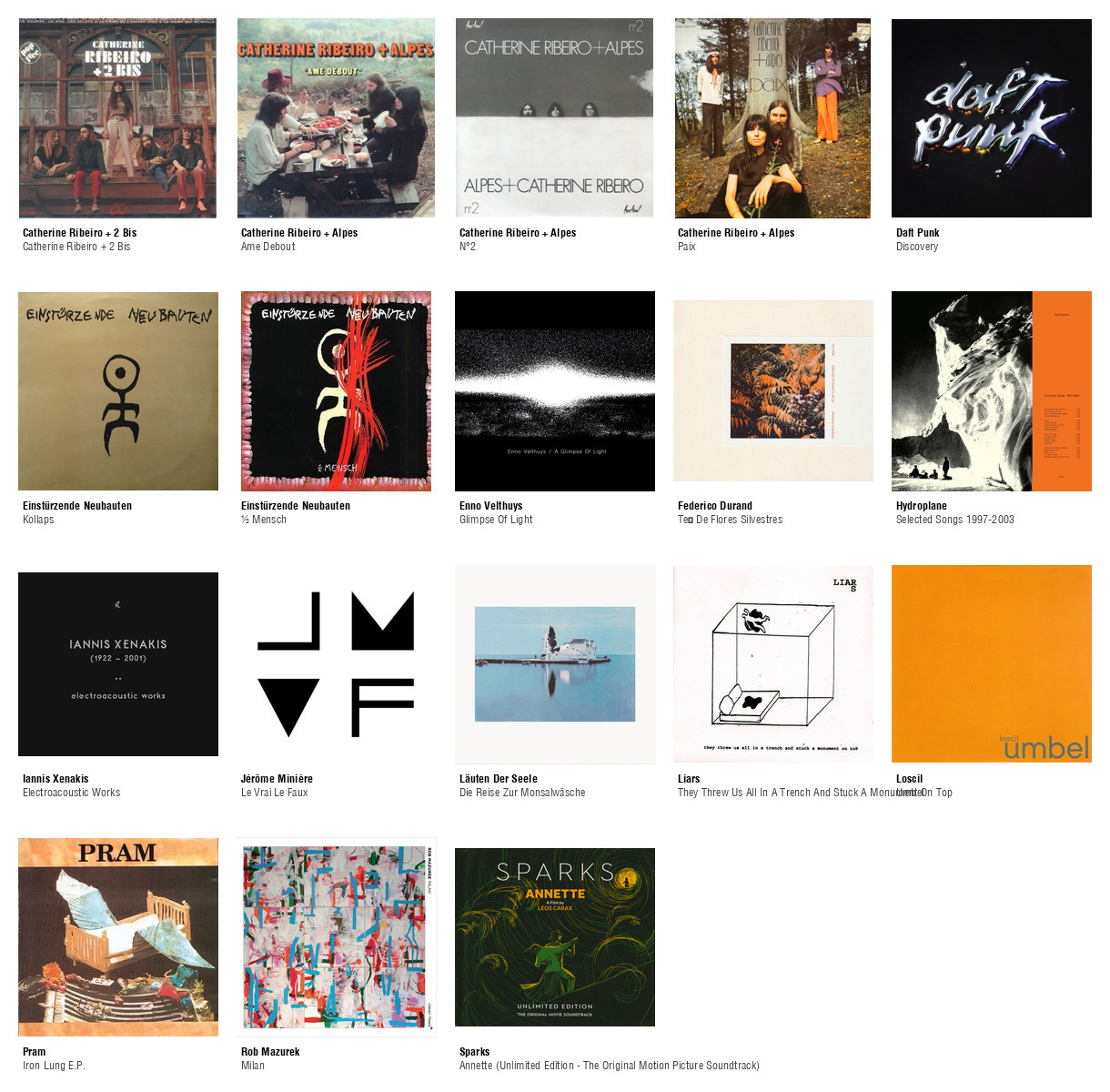 ![Collage des pochettes des albums de Dominique A (Tout Sera Comme Avant), Benni Hemm Hemm (Eliminate Evil, Revive Good Times), Benni Hemm Hemm (Murta St. Calunga), Benni Hemm Hemm (Retaliate), Bertrand Betsch (Au Top), Bertrand Betsch (La Soupe À La Grimace), Bertrand Betsch (Mostla Betsch Tape), Boards Of Canada (Geogaddi), Clogs (Lullaby For Sue), Roberto Delgado (Lounge Legends), The Durian Brothers / Ensemble Skalectrik (Split Series #22), La Fresto (Morphamase), Gastr Del Sol (Camofleur), Gastr Del Sol (We Have Dozens Of Titles), Gnod / White Hills (Gnod Drop Out With White Hills III), Charbel Haber, Joseph Ghosn, Fadi Tabbal (The Stones That Never Ask The Night For Cover), The House Of Love (The House Of Love [Fontana]), Hydroplane (Shoulder To Shoulder : Collected Singles 1996 - 1998), Robert Mazurek, Exploding Star Orchestra (Lightning Dreamers), Getatchew Mekuria, The Ex & Guests (Moa Anbessa), Jérôme Minière (Le Vrai Le Faux [Réédition]), Ø (Kuvio), Ø (Metri), Ø (Sysivalo), Oh Sees (Orc), Perio (Chunk Of Songs), Pink Floyd (Dark Side Of The Moon), Pink Floyd (The Wall), Benoit Pioulard (Hymnal), James Plotkin & Paal Nilssen-Love (Death Rattle), Pram (Gash), Pram (The Moving Frontier), Six Organs Of Admittance (For Octavio Paz), Sparks (Annette (Unlimited Edition - The Original Movie Soundtrack)), Spunk (En Aldeles Forferdelig Sykdom), Vainio & Vigroux (Peau Froide, Léger Soleil), Various (Now That's What I Call Scum!) et quelques autres](https://files.mastodon.social/cache/media_attachments/files/115/325/542/293/482/546/small/08eeb2f523245c64.jpg)