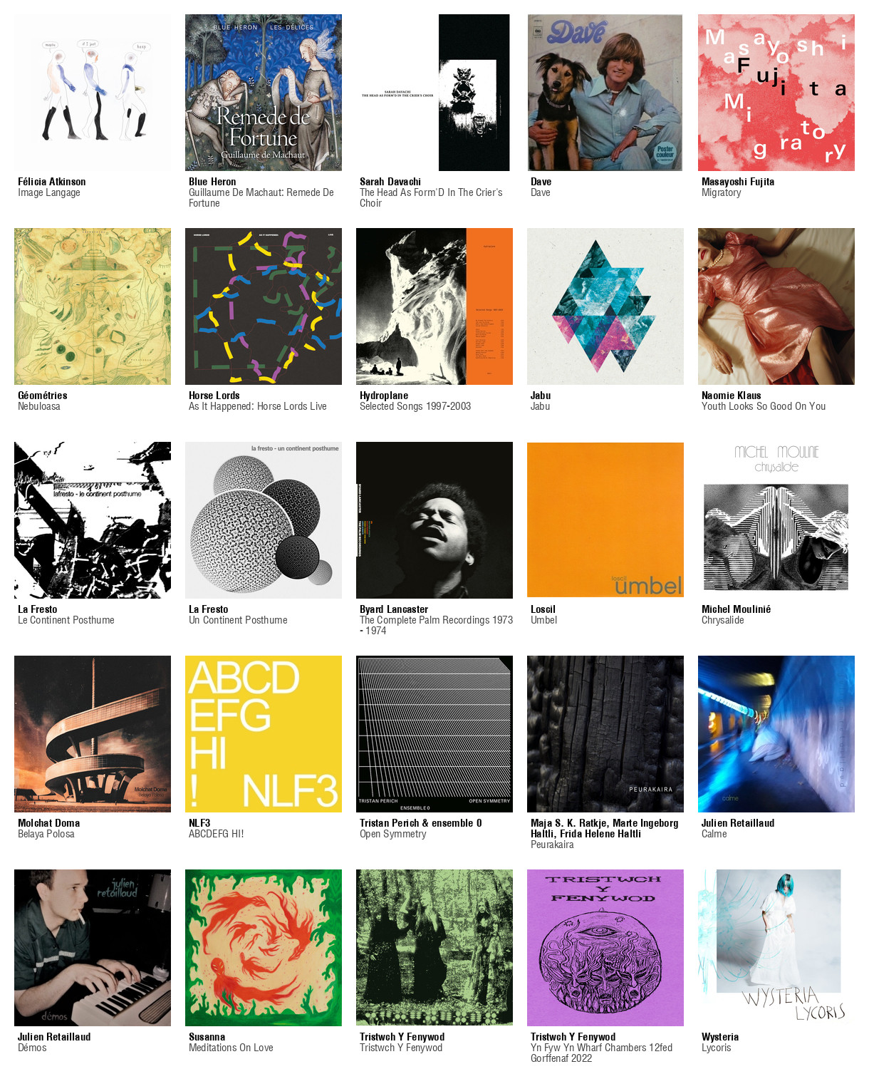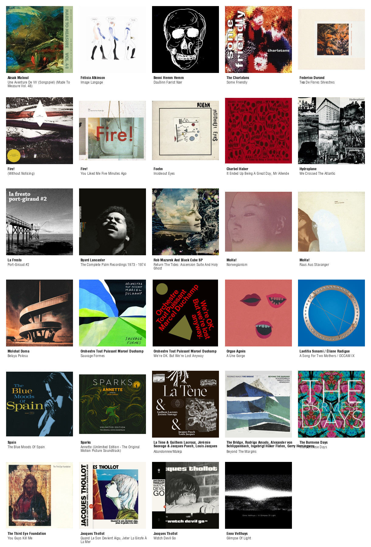 ![Collage des pochettes des albums de Aksak Maboul (Une Aventure De VV (Songspiel) (Made To Measure Vol. 48)), Félicia Atkinson (Image Langage), Benni Hemm Hemm (Dauðinn Færist Nær), The Charlatans (Some Friendly), Federico Durand (Té De Flores Silvestres), Fire! ((Without Noticing)), Fire! (You Liked Me Five Minutes Ago), Foehn (Insideout Eyes), Charbel Haber (It Ended Up Being A Great Day, Mr Allende), Hydroplane (We Crossed The Atlantic), La Fresto (Port-Giraud #2), Byard Lancaster (The Complete Palm Recordings 1973 - 1974), Rob Mazurek And Black Cube SP (Return The Tides: Ascension Suite And Holy Ghost), MoHa! (Norwegianism), MoHa! (Raus Aus Stavanger), Molchat Doma (Belaya Polosa), Orchestre Tout Puissant Marcel Duchamp (Sauvage Formes), Orchestre Tout Puissant Marcel Duchamp (We're OK. But We're Lost Anyway [Colored LP]), Orgue Agnès (A Une Gorge), Laetitia Sonami / Éliane Radigue (A Song For Two Mothers / OCCAM IX), Spain (The Blue Moods Of Spain), Sparks (Annette (Unlimited Edition - The Original Motion Picture Soundtrack)), La Tène & Guilhem Lacroux, Jérémie Sauvage & Jacques Puech, Louis Jacques (Abandonnée/Maléja), The Bridge, Rodrigo Amado, Alexander von Schlippenbach, Ingebrigt Håker Flaten, Gerry Hemingway (Beyond The Margins), The Burmese Days (The Burmese Days), The Third Eye Foundation (You Guys Kill Me), Jacques Thollot (Quand Le Son Devient Aigu, Jeter La Girafe À La Mer), Jacques Thollot (Watch Devil Go), Enno Velthuys (Glimpse Of Light)](https://files.mastodon.social/cache/media_attachments/files/113/105/881/204/035/961/small/05be66933d0680e4.jpg)