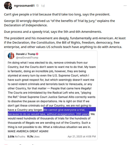 The #Trump regime is shredding #constitutionalrights, ignoring #dueprocess & the importance of #courts & #trials. Due process is a cornerstone of #democracy, everyone deserves due process.