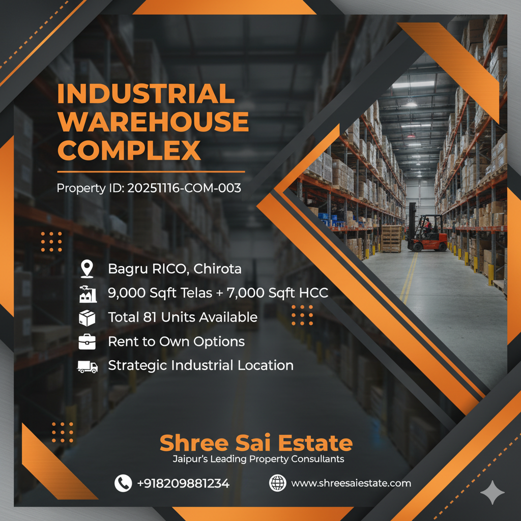 ⚡ INDUSTRIAL POWERHOUSE ALERT! Premium RIICO warehouse complex in Bagru. 9,000 sqft Telas + 7,000 sqft HCC construction. 81 units ready for manufacturing, storage, logistics. Flexible payment: Rent OR Buy. RIICO approved, excellent connectivity. Scale your business NOW!