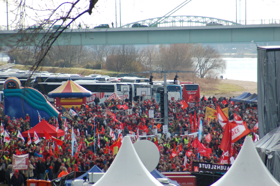 Zahlreiche von Kündigung bedrohte FORD-Arbeiter*innen der Kölner Autowerke nahmen an der Kundgebung teil. Die rund 23.000 Gewerkschafter*innen wurden mit Deutschrock, Essensständen und Kinderprogramm bei Laune gehalten. Während die IG Metall-Führungsriege von der Bühne die Illusion eines grünen Kapitalismus durch Wasserstoff in der Stahlproduktion verbreitete.