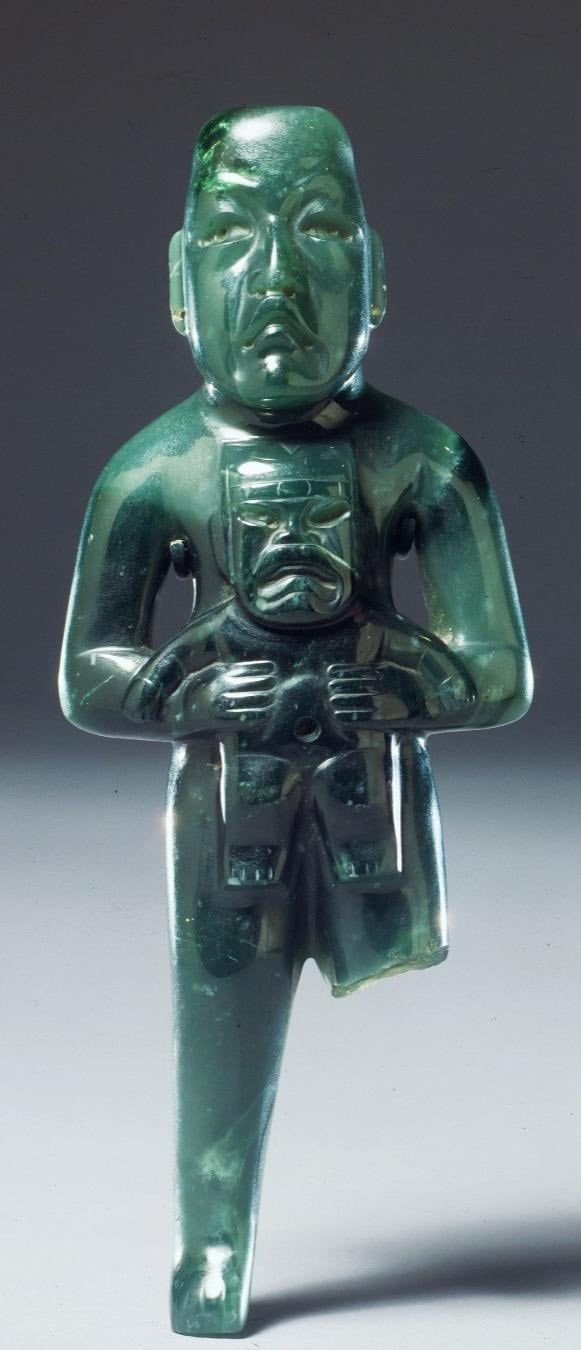 Olmec statuette depicting a figure holding a were-jaguar baby, jade, Mexico, 900 BCE-300 BCE