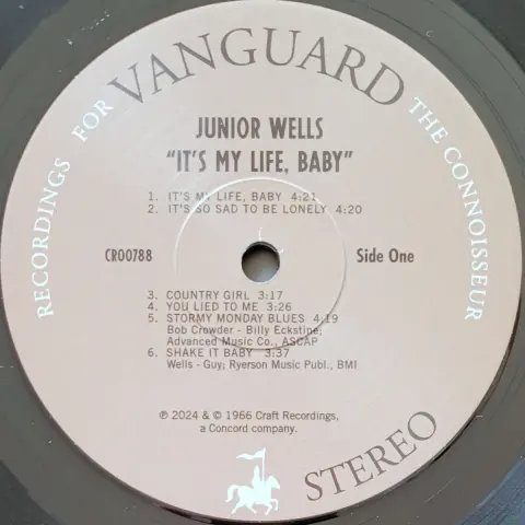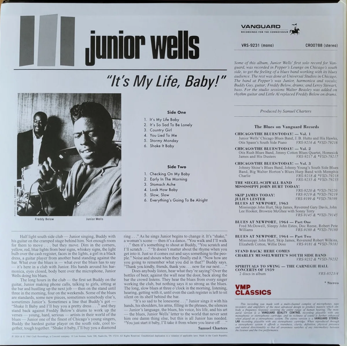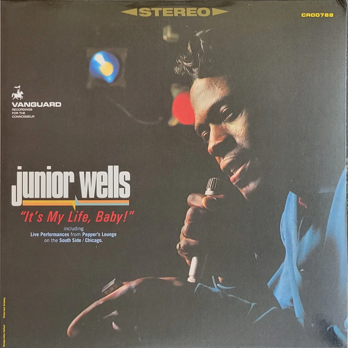 Some of this album, Junior Wells’ first solo record for Vanguard, was recorded in Pepper’s Lounge on Chicago’s south side, to get the feeling of a blues band working with its blues audience. The rest was done at Universal Studios in Chicago. The band at Pepper’s was Junior, harmonica and vocals; Buddy Guy, guitar; Freddy Below, drums; and Leroy Stewart, bass. For the studio sessions Walter Beasley was added on rhythm guitar and Little Al replaced Freddy Below on drums.