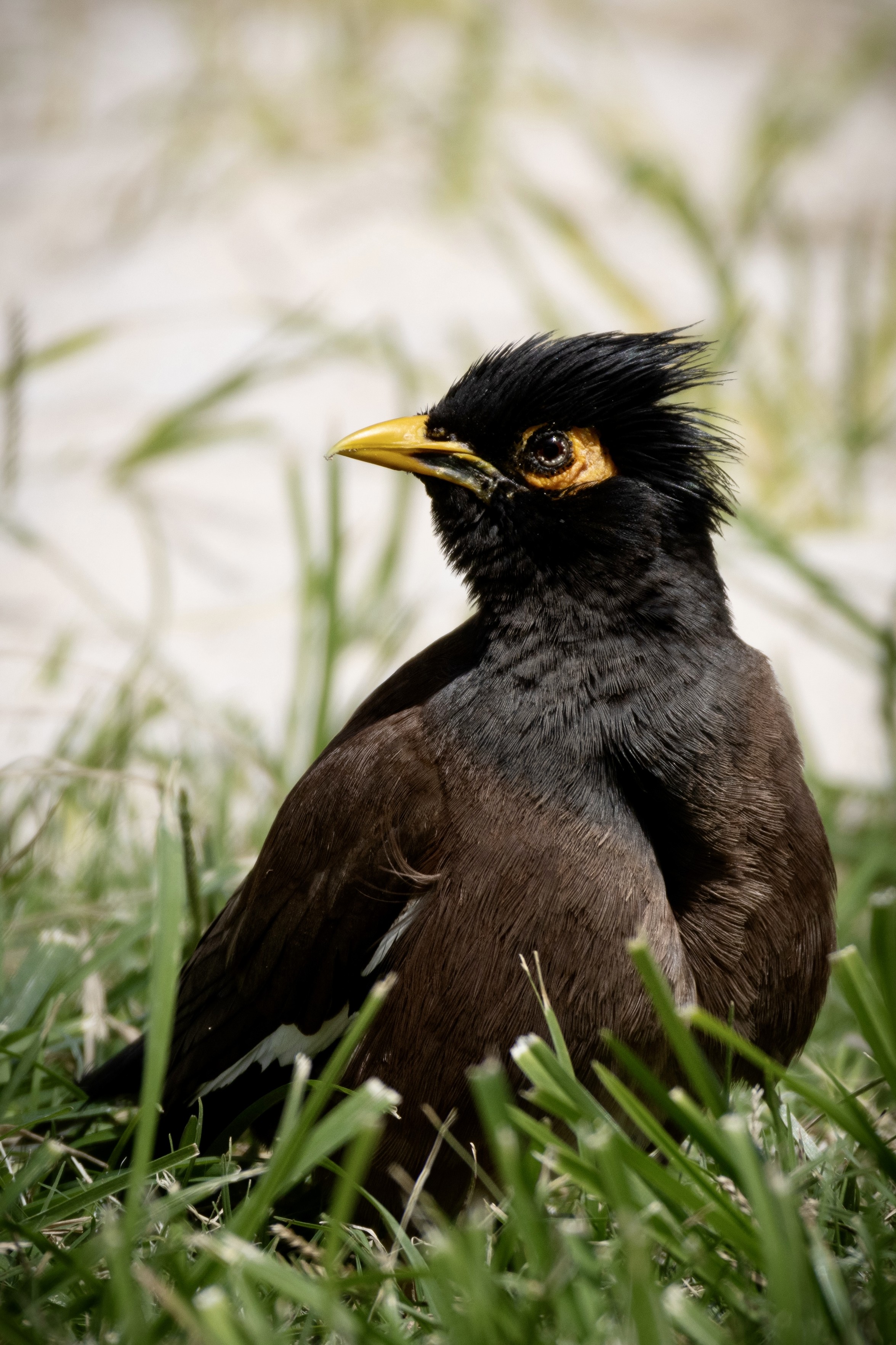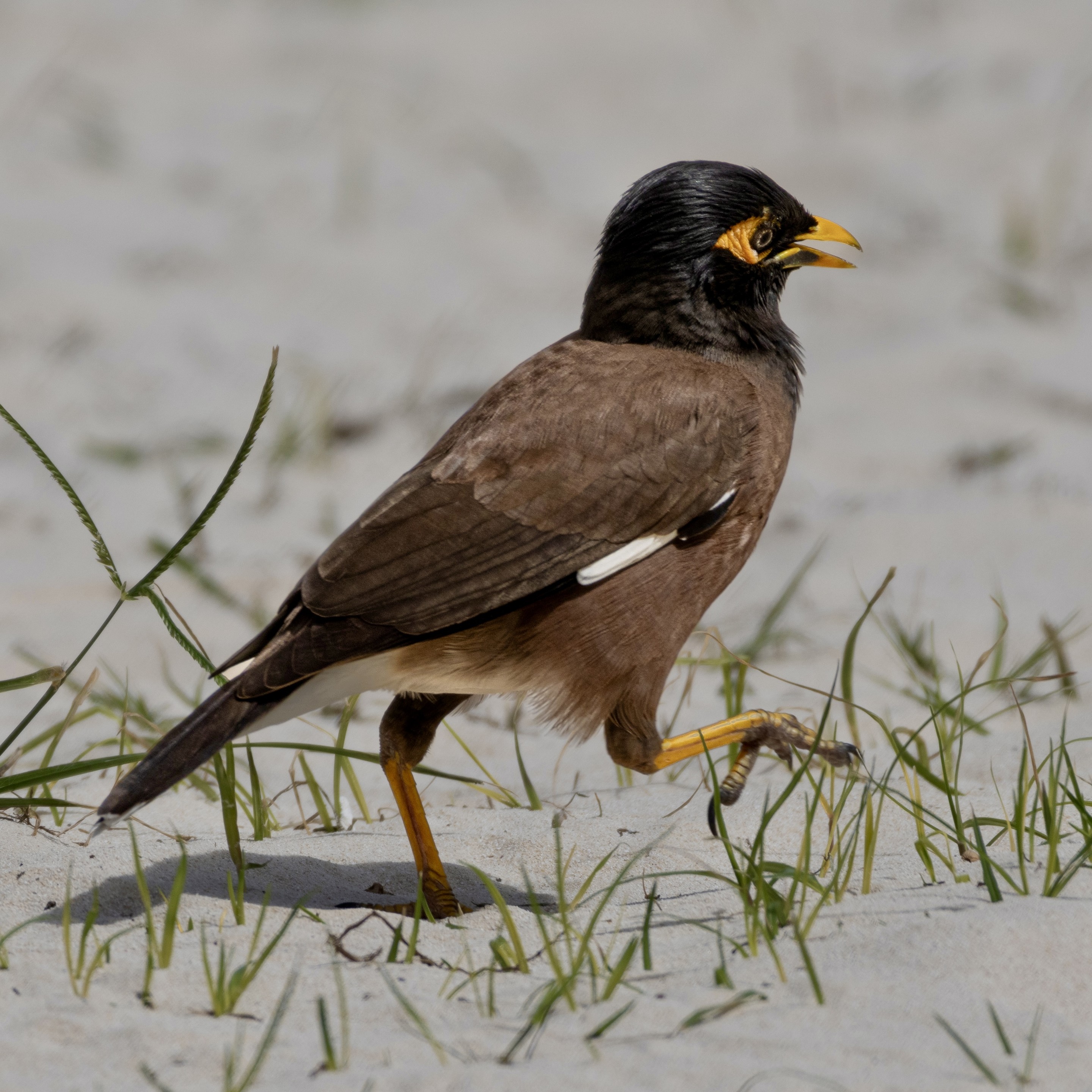 Another shot from Kailua Beach of the common myna bird. This one was walking over the sand, but with high steps that make it look like it if stomping along.
