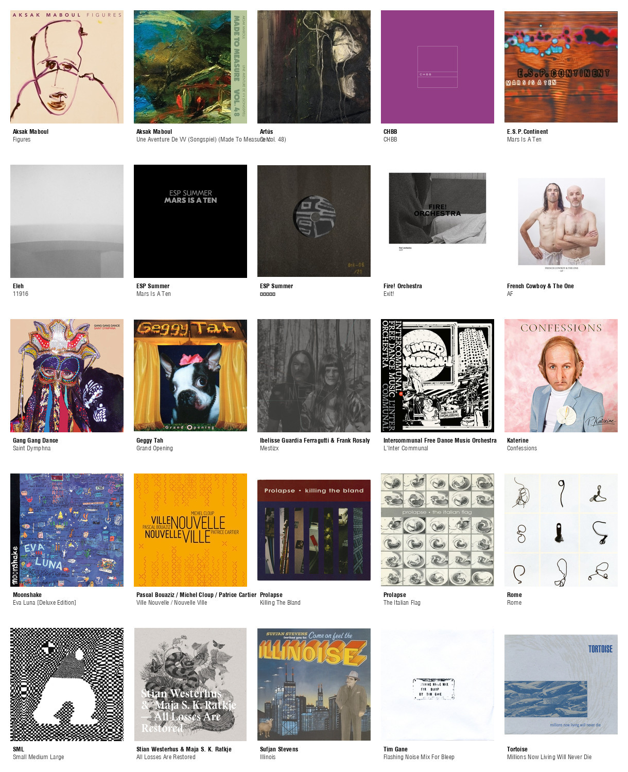 ![Collage des pochettes des albums de Aksak Maboul (Figures), Aksak Maboul (Une Aventure De VV (Songspiel) (Made To Measure Vol. 48)), Artús (Cerc), CHBB (CHBB), E.S.P.Continent (Mars Is A Ten), Eleh (11916), ESP Summer (Mars Is A Ten), ESP Summer (天国の王国), Fire! Orchestra (Exit!), French Cowboy & The One (AF), Gang Gang Dance (Saint Dymphna), Geggy Tah (Grand Opening), Ibelisse Guardia Ferragutti & Frank Rosaly (Mestizx), Intercommunal Free Dance Music Orchestra (L'Inter Communal), Katerine (Confessions), Moonshake (Eva Luna [Deluxe Edition]), Pascal Bouaziz / Michel Cloup / Patrice Cartier (Ville Nouvelle / Nouvelle Ville), Prolapse (Killing The Bland), Prolapse (The Italian Flag), Rome (Rome), SML (Small Medium Large), Stian Westerhus & Maja S. K. Ratkje (All Losses Are Restored), Sufjan Stevens (Illinois), Tim Gane (Flashing Noise Mix For Bleep), Tortoise (Millions Now Living Will Never Die)](https://files.mastodon.social/cache/media_attachments/files/112/947/305/399/819/777/small/5cfcd57c6e9a1cea.jpg)