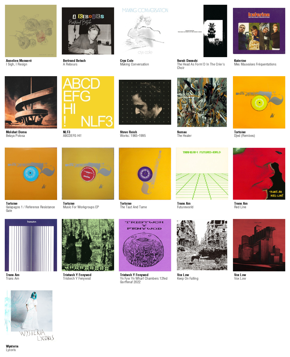 ![Collage des pochettes des albums de Ad Vanz Vs Gescom / Foehn (Split Series #2), Ahmed Ag Kaedy & Will Guthrie (Tidawt), Arashi with Takeo Moriyama (Tokuzo), Bertrand Betsch (La Traversée, Album Bonus), Clogs (Veil Waltz), Dedalus Ensemble (Philip Glass Performed By Dedalus Ensemble: Music With Changing Parts), Dub Narcotic Sound System (Industrial Breakdown), Brigitte Fontaine, Areski Belkacem (Vous Et Nous), Francis Et Ses Peintres feat. Katerine (La Paloma), Garaventa (Casual Drama), Groop (This Place Is The Space), Growing (Dry Drunk On Woman), Steve Gunn (Too Early For The Hammer), Humcrush (Rest At Worlds End), Katerine (Confessions), Katerine, Francis Et Ses Peintres (52 Reprises Dans L'Espace), Marie Klock (Marie Klock), Lucrate Milk (Live At Pont-À-Mousson), Rob Mazurek, Exploding Star Orchestra (Live At The Adler Planetarium), [minmae] (Sa Trappe Secrete Por Trouver La Paix), Molchat Doma (Belaya Polosa), Mondkopf (Waves (Selected Works)), Ø (Sysivalo), Osees (Abomination Revealed At Last), The Ohsees (Grave Blockers EP), Playdoh (Démo), Steve Reich (Collected Works), Le Révélateur (Extreme Events), Rien Virgule (Berceuses Des Deux Mondes), Sanam (Sametou Sawtan), SML (Small Medium Large), Stereolab (Fed Up With Your Job / Constant And Uniform Movement Unknown), Stereolab (Instant Holograms On Metal Film), John Surman (The Amazing Adventures Of Simon Simon), Mohammad Syfkhan (I Am Kurdish), Tortoise (Millions Now Living Will Never Die) et quelques autres](https://files.mastodon.social/cache/media_attachments/files/115/285/587/990/943/861/small/d033aaf8230c01ba.jpg)