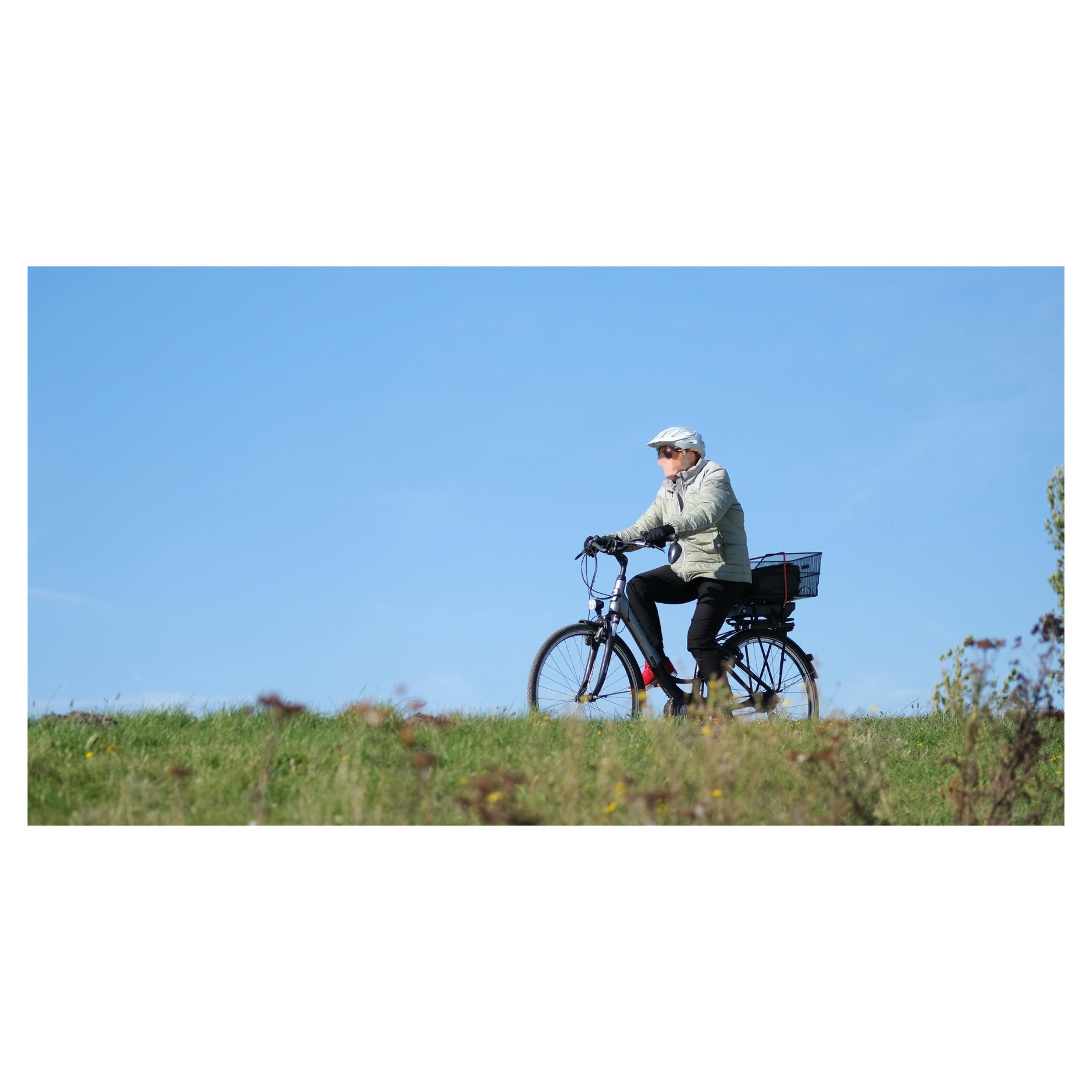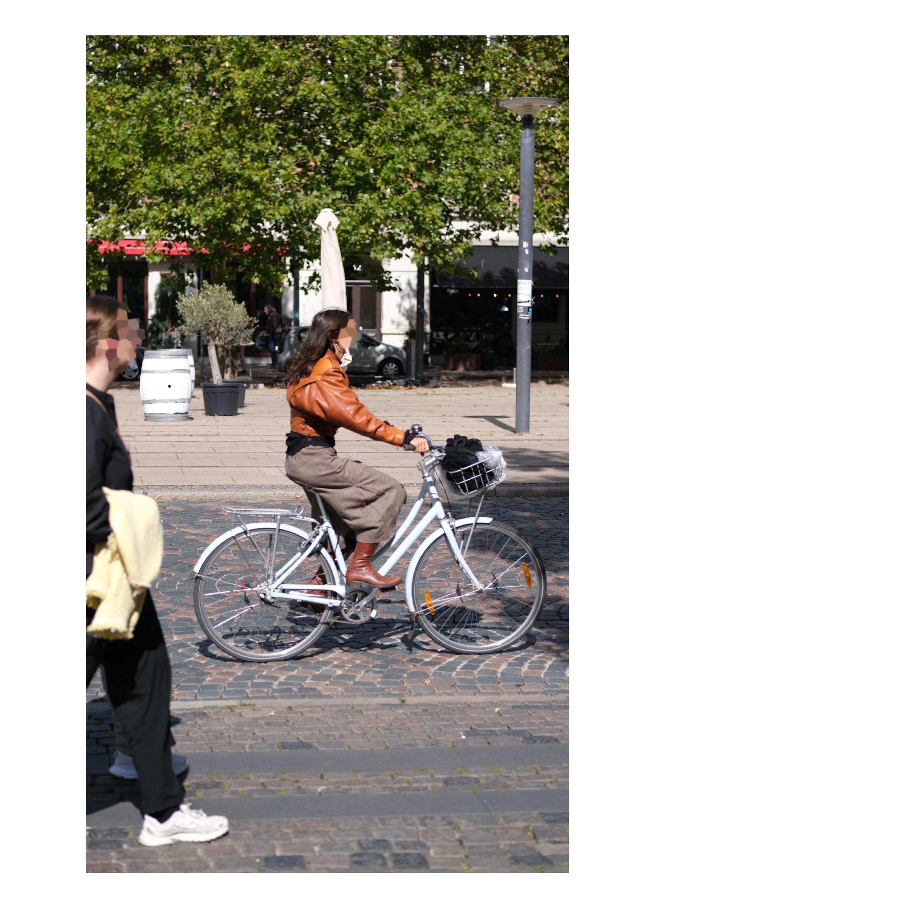 Moment nicht ganz getroffen, Fokus daneben gesetzt - das Bild unscharf zeigen oder besser nicht? Mir gefällt ihr Outfit so gut, dass ich drüber hinweg sehen will, weil doch erkennbar bleibt, auf was es (mir) in dem Bild ankommt. Die Kombination aus Kleidung, Fahrrad, Fahrradfahren und Stadt als Lebensraum, der sie ermöglicht und bedingt. Weiter Rock, aufgeplusterte Lederjacke, flatternder Blusenkragen.