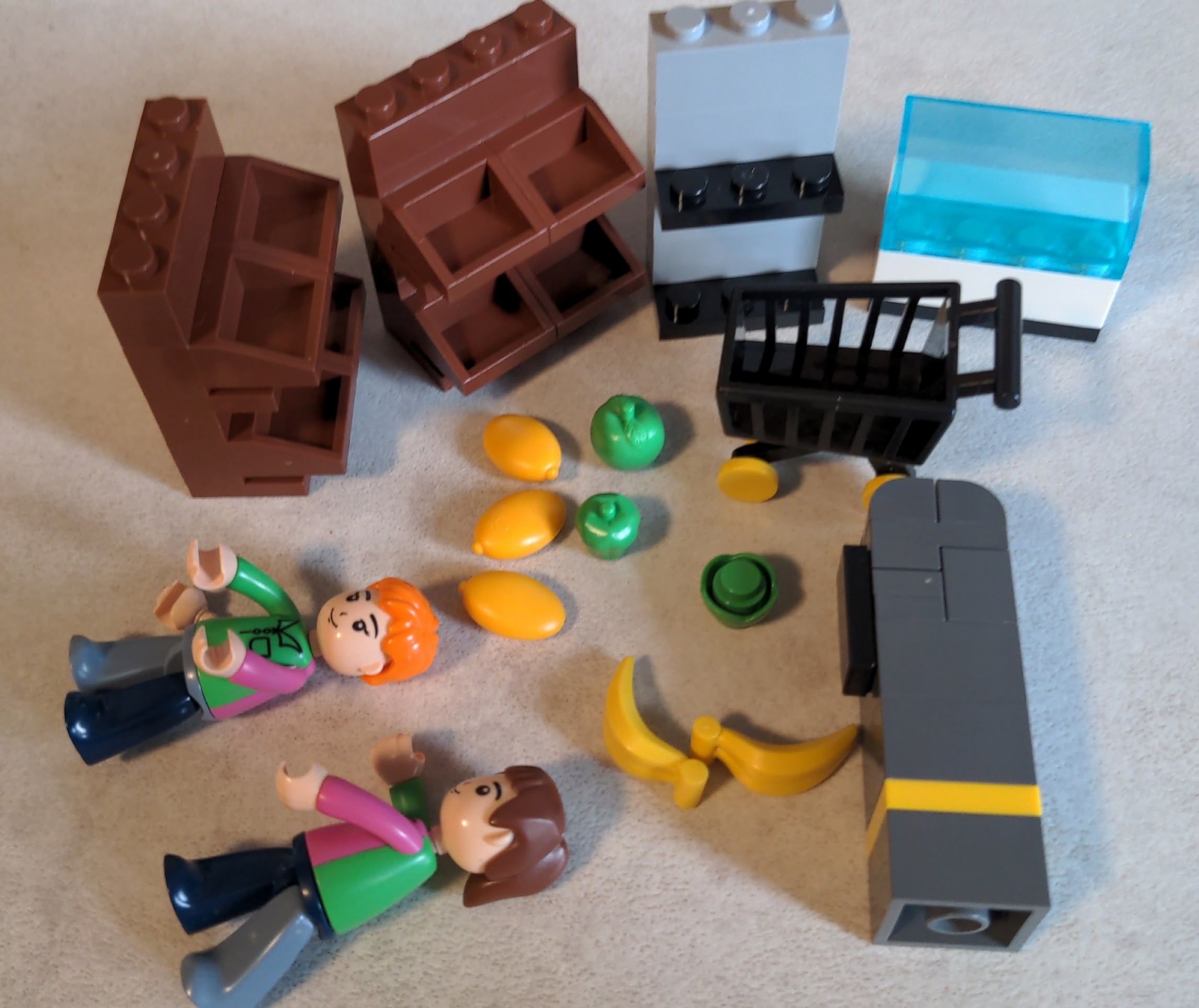 - Beim Frischeset ist ein Teil mehrfach in braun dabei, das an „Tile, Modified 1 x 2 with Bar Handle“ erinnert, aber hinten zu ist.