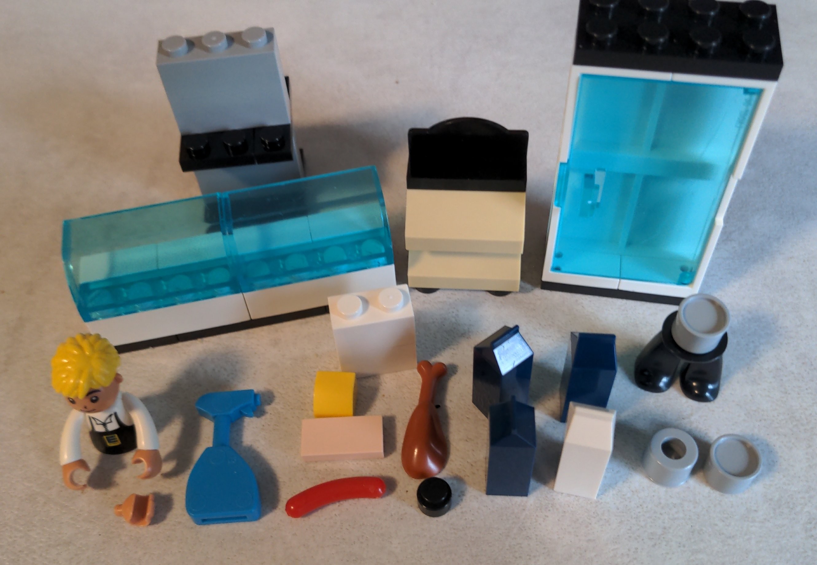 - Die Tetrapaks aus dem Bedienthekenset sind 1×1 Bricks (modified) mit insgesamt 2⅔ Höhe. Es sind drei in dunkelblau und eins in weiß dabei. Die kann man vielleicht für Verzierungen an Dächern, Mauern, Zäunen oder Kaminen verwenden.