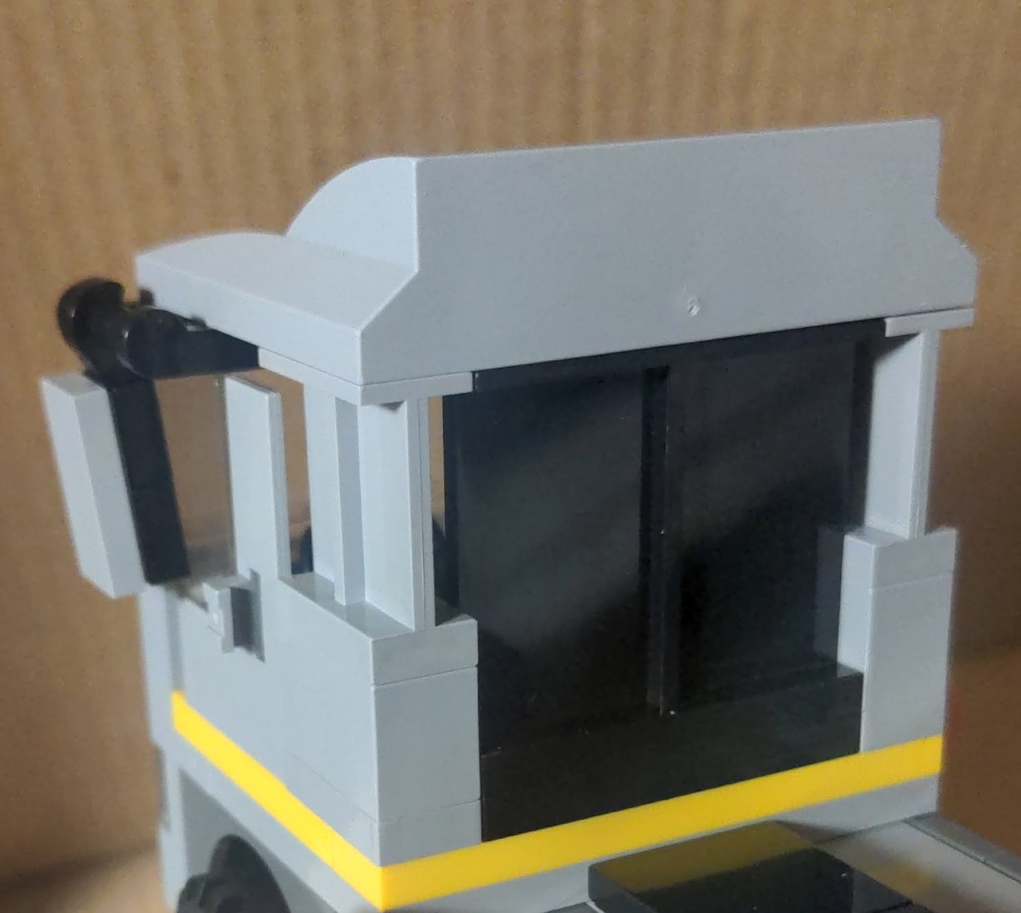 - Das Führerhaus wirkt, als hätte man es sich selbst als B-Modell gebaut und nicht genug Teile gehabt. Man kann an mehreren Stellen hineinschauen, wo das nicht beabsichtigt scheint. Hätte man nicht jeden Cent gespart, hätte man hier einfach Steine statt Paneelen nehmen können und es wäre nur noch die ⅓ hohe Lücke über den Türen ein Problem. Dann noch zwei 1×1 Plates in schwarz und alles wäre dicht.