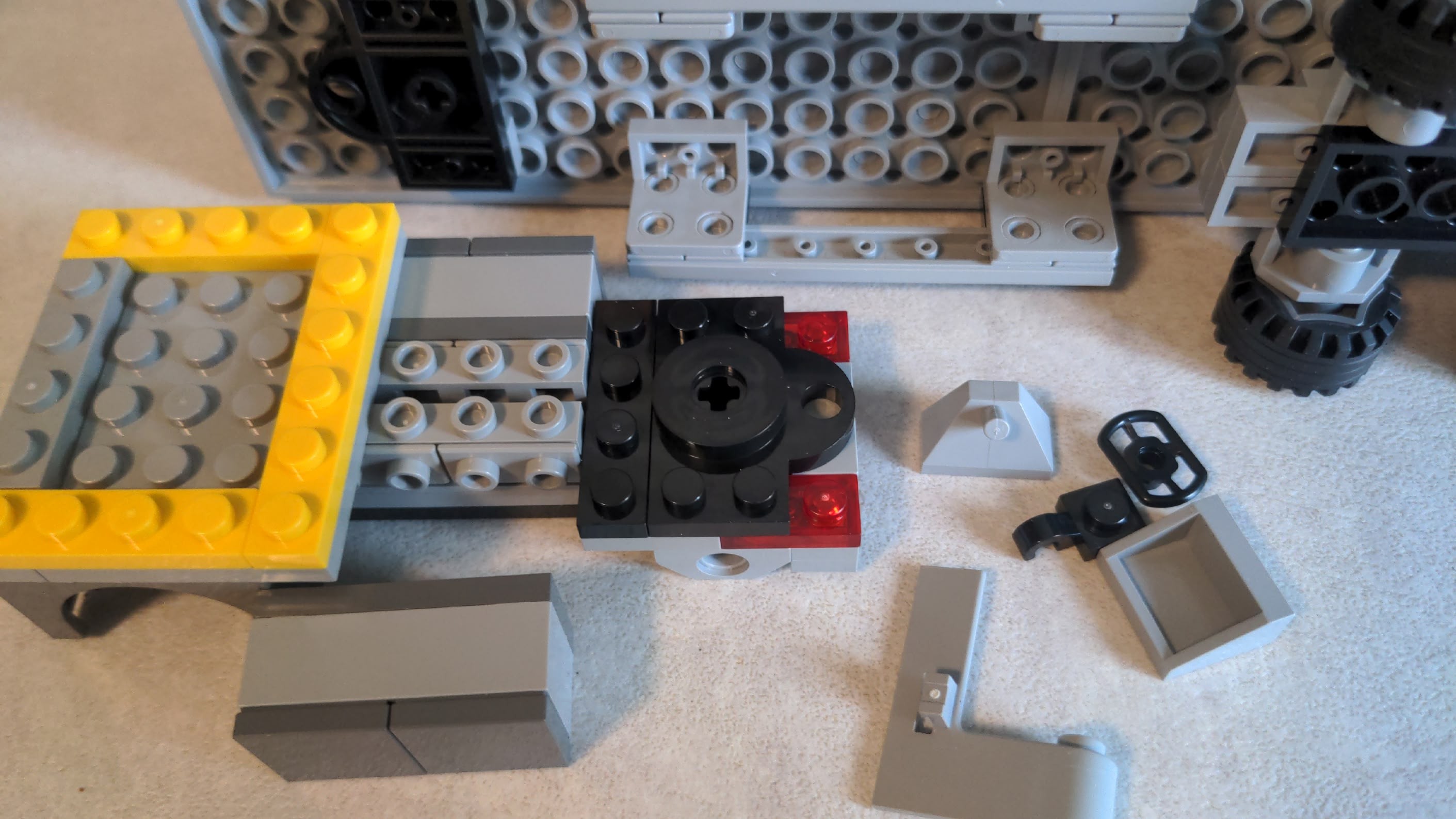 - Die Klappe ist mit vier 1×1 Plates mit Clip befestigt. Dadurch lösen sich bei wiederholtem Öffnen und Schließen irgendwann die Noppen.