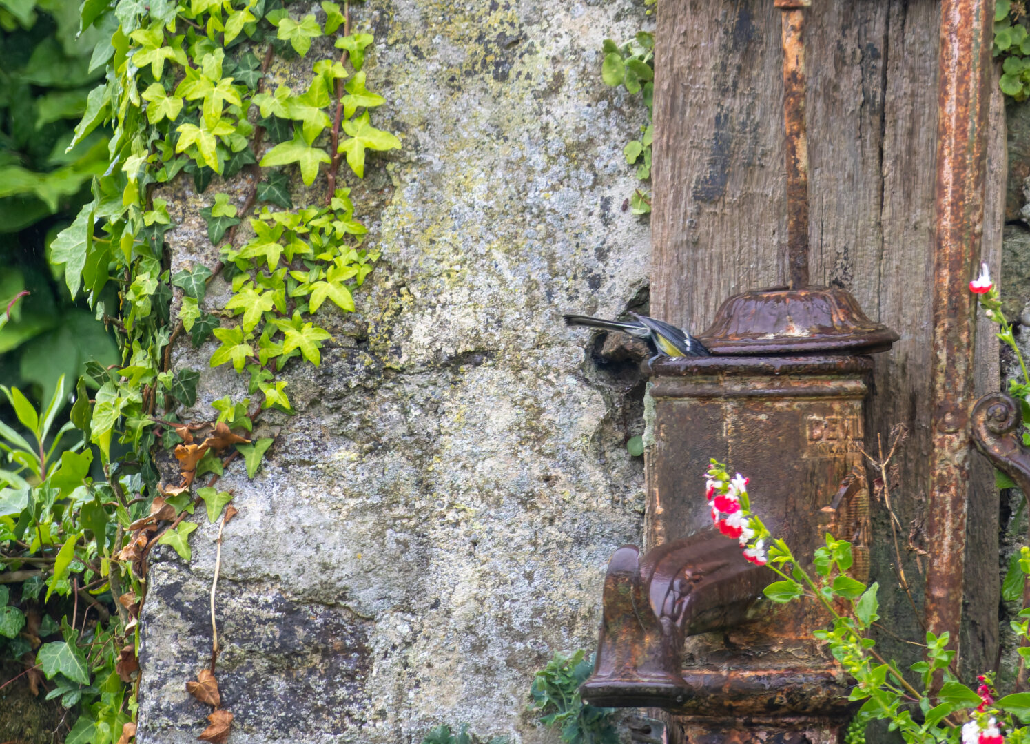 Die Meisen haben die zweite Brut in diesem Jahr großgezogen. Heute wurde schon hektisch draußen im Baum und noch drinnen im Kasten gefüttert, und jetzt werden die Kleinen schnatternd durch die regennassen Büsche gelotst.