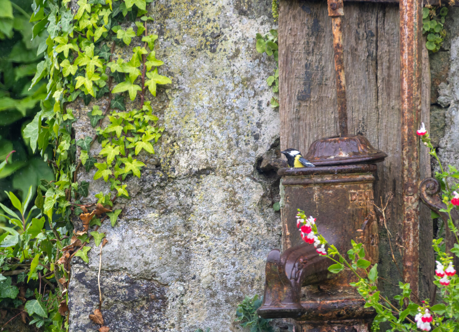 Ich sitze mit Laptop um zu schreiben im #BotanischerGartenRostock und kann beobachten, wie hier vor mir direkt #Kohlmeisen baden! (Grüße an @wurzelmann an dieser Stelle!).