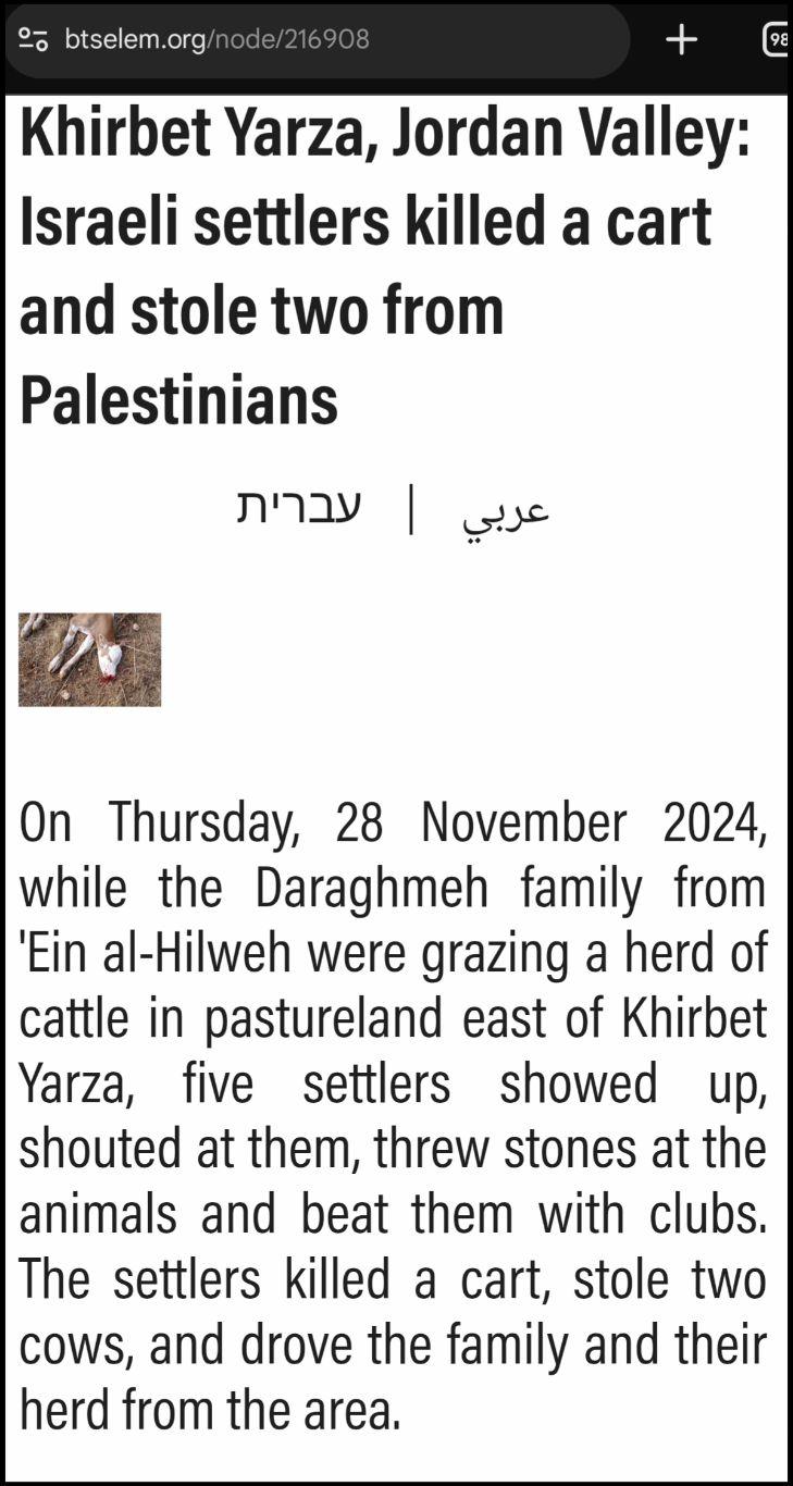On Thursday, 28 November 2024, while the Daraghmeh family from 'Ein al-Hilweh were grazing a herd of cattle in pastureland east of Khirbet Yarza, five settlers showed up, shouted at them, threw stones at the animals and beat them with clubs. The settlers killed a cart, stole two cows, and drove the family and their herd from the area.](https://files.mastodon.social/cache/media_attachments/files/115/510/462/672/426/796/small/35c1e2688d138aae.jpg)
