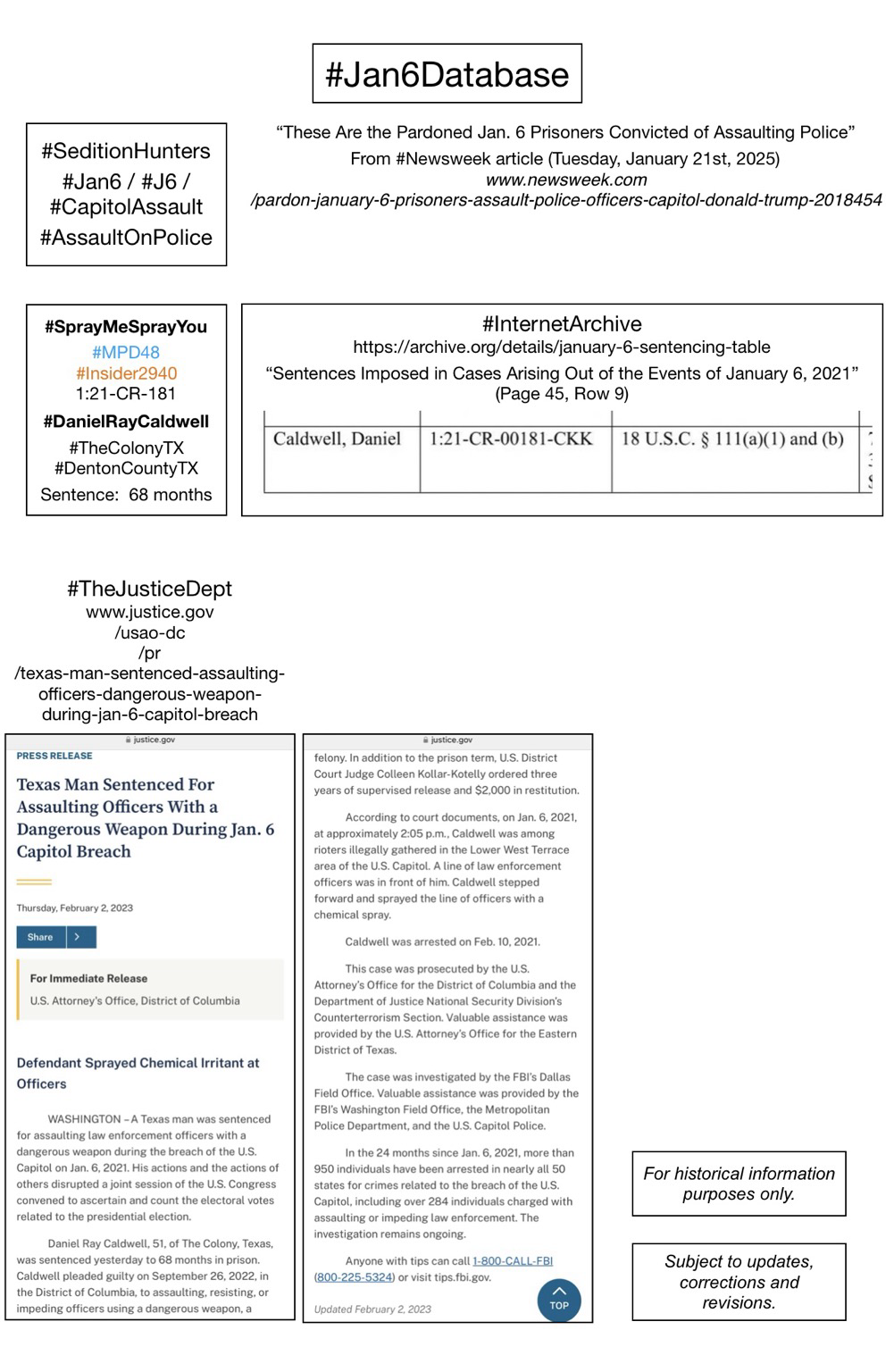 Links: https://jan6attack.com/individuals/spraymesprayyou/index.htm, https://jan6evidence.com/#/gallery/SprayMeSprayYou, https://seditionhunters.org/danielcaldwell, https://seditionhunters.org/seditioninsiders, https://archive.org/details/january-6-sentencing-table, https://www.justice.gov/usao-dc/pr/texas-man-sentenced-assaulting-officers-dangerous-weapon-during-jan-6-capitol-breach