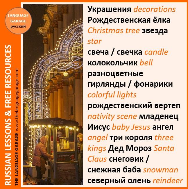 Украшения (decorations): #Christmas #holidays in #Russian #LearnRussian #languages. Visit us to learn more. https://thelanguagegarage.com/the-holiday-season-in-russian/
