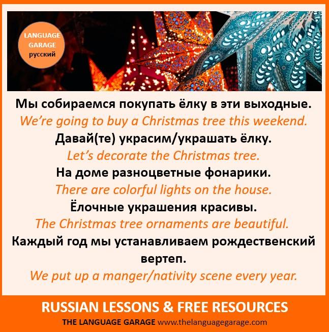 Повсюду звучит рождественская музыка. There is Christmas music everywhere. #Christmas #holidays in #Russian #LearnRussian #languages. Visit us to learn more. https://thelanguagegarage.com/the-holiday-season-in-russian/