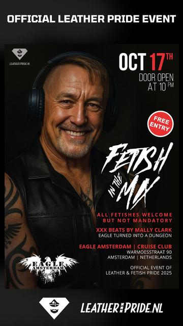 Leather & Fetish Pride at Eagle Amsterdam with Fetish in the Mix, come in gear or just as you are. Naked or underpants? Then you get the coat check for free! Live DJ Mally Clark for pumping beats until 05:00. Free Entry! #leatherpridenl #leatherpride #amsterdam #wearefetish #eagleamsterdam #weareeagle #gayparty