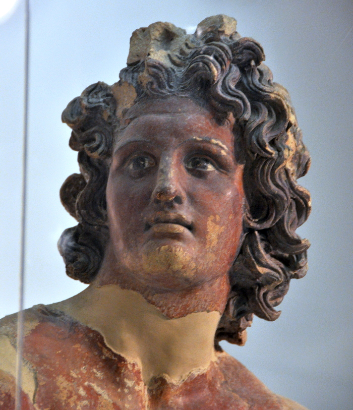 In Falerii is verschrikkelijk mooie terracotta-sculptuur gevonden, die voor het merendeel is terechtgekomen in de Villa Giulia, het Etruskische museum van Rome. Bovenstaande kop komt uit een tempel die stond op een plek genaamd Sassi Caduti. Dit heiligdom, even ten westen van de acropolis, was gewijd aan de godheid die de Romeinen Mercurius noemden en de Etrusken Turms. Hij was de boodschapper van de oppergod Tinia, beschermde de handel en begeleidde de dode zielen op weg naar de Onderwereld. Bij Sassi Caduti is ook een marktplein gevonden, wat natuurlijk wel zo gepast is voor een god van de handel.