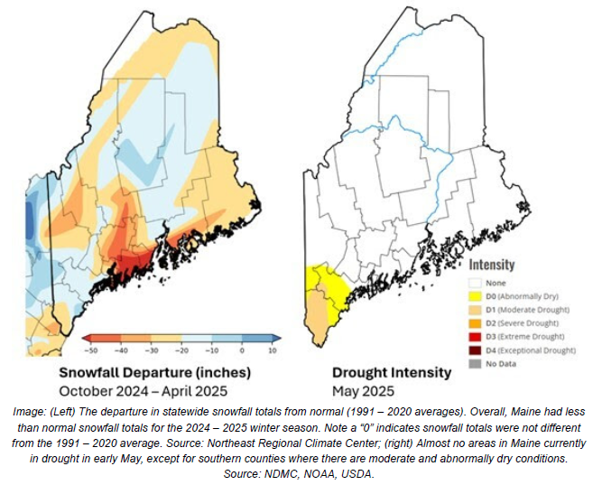 "In the last 12 months (May 2024 – April 2025), the state average precipitation was approximately 43 inches, which is about normal. However, areas of northern Somerset County, and Midcoast and Downeast towns have experienced 25 – 50% less than normal precipitation. Maine had very dry conditions beginning in late September, with the entire state categorized as abnormally dry or moderate drought conditions lasting until December. In late April 2025, many wildfires appeared across the state, aided by strong winds and dry conditions. Drought conditions are not expected to continue through May."