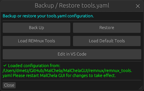 - Alternate profiles (like REMnux setups) can be managed simply by swapping `tools.yaml` files via the GUI
