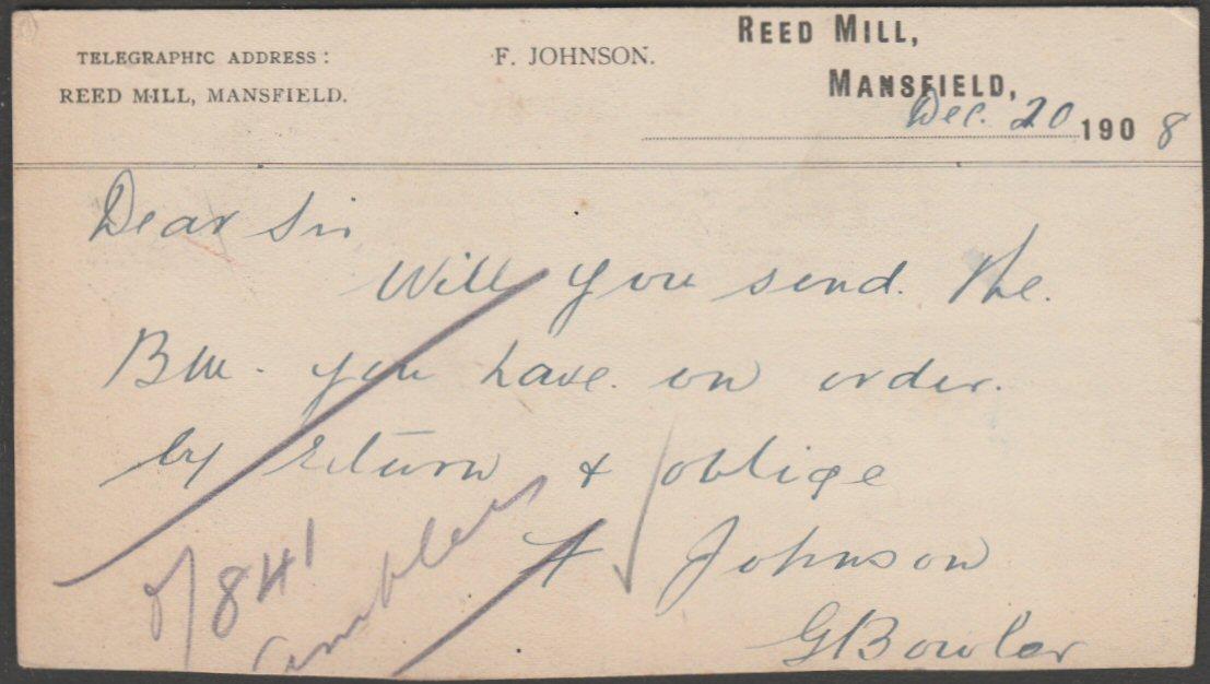 Request for Bill, F Johnson, Reed Mill, Mansfield, Notts, 1908 - Postcard