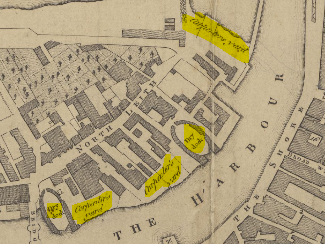 Wood’s town plan showing the Simes’ “Carpenters’ Yard”. Their dry dock is that in the centre of the map above the “A” of the word Harbour. From the collection of the WS Society. Reproduced with the permission of the National Library of ScotlandThis dock is still there, by the way, it’s just filled in and you just have to look for the outline of the coping stones in the open grass area and on the quayside.