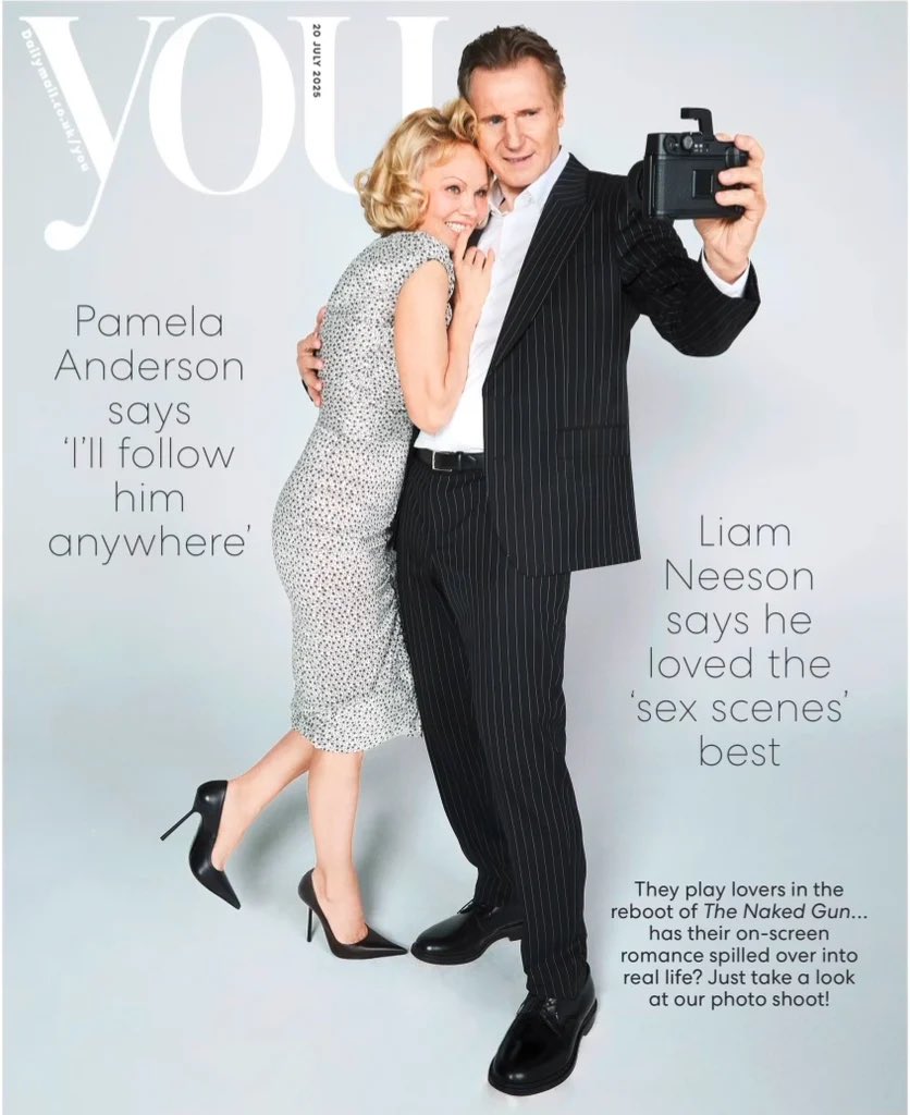 Liam Neeson y Pamela Anderson en una divertida sesión de fotos que desafía estereotipos de edad.
