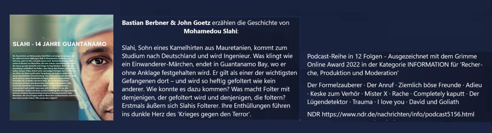 → 12-teiliger Podcast von Bastian Berner & John Goetz, die über Slahi's Guantanamo-Tagebuch hinaus in einem lebendigen & dialogischen Stil weitere Facetten & Zusammenhänge aufzeigen. https://www.ndr.de/nachrichten/info/podcast5156.html #MohamedouSlahi #Guantanamo #Terror #Podcast https://www.grimme-online-award.de/archiv/2022/preistraeger/preistraeger-detail/d/slahi-14-jahre-guantanamo-1 #GrimmePreis #MedienPreis